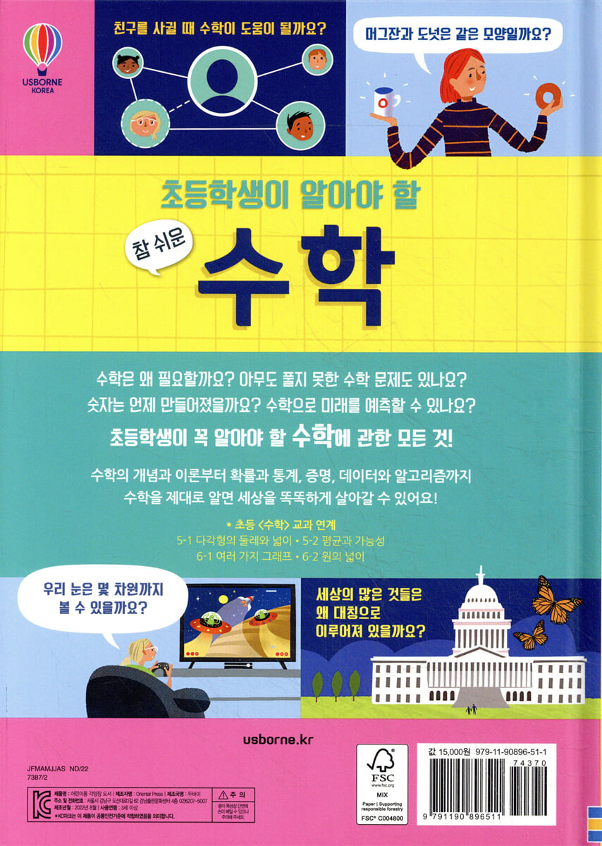 ‘수학은 왜 필요할까요? 아무도 풀지 못한 수학 문제도 있나요? 숫자는 언제 만들어졌을까요? 수학으로 미래를 예측할 수 있나요?’ 수학을 제대로 알면 세상을 똑똑하게 바라볼 수 있어요! ◆ 수학의 개념과 원리부터 확률과 통계, 증명, 데이터와 알고리즘까지 초등학생이 꼭 알아야 할 수학의 모든 것 * 초등 〈수학〉 교과 연계 5-1 다각형의 둘레와 넓이 · 5-2 평균과 가능성 6-1 여러 가지 그래프 · 6-2 원의 넓이 총 여덟 장으로 구성된 이 책은 수와 숫자, 도형과 규칙, 통계 등 필수 수학 개념부터 수학을 이용한 컴퓨터와 알고리즘, 인공 지능까지 다양한 수학 지식을 조목조목 풀어나간다. 수학의 여러 분야와 개념을 이해함과 더불어 우리 생활 속 수학의 응용까지 살펴보며 세상의 모든 현상에 숨어 있는 수학의 원리를 알 수 있다. 제1장에서는 옛날 사람들은 수를 어떻게 세었고, 숫자는 언제 만들었는지 등 수학의 역사에 대해 살펴본다. 제2장에서는 소수와 완전수, 난수 등 다양한 수를 문제 예시와 함께 소개하며 수는 우리 생활 속 어디에나 밀접하게 연관되어 있다는 것을 이해한다. 이어서 제3장에서는 도형을 연구하는 수학 분야인 ‘기하학’에 대해 알아보고, 건축학이나 천문학 등 다양한 학문 분야에서 수학을 어떻게 활용하는지 살펴본다. 제4장에서는 도표와 그래프를 통해 수학을 그림으로 나타내는 법을 알고, 까다로운 수학 문제를 쉽게 이해하는 방법을 찾아낸다. 제5장 ‘증명하기’에서는 아직 아무도 증명하지 못한 수학 문제를 소개하며 증명이 왜 중요한지, 수학에서 어떤 역할을 하는지 알아본다. 제6장에서는 수학을 이용해 자료를 수집하고 분석하는 ‘확률과 통계’에 대해 살펴본다. 나아가 제7장에서는 수학으로 컴퓨터와 프로그램을 만들고, 수학이 우리 삶에 어떤 도움을 주는지 생각해 본다. 마지막 제8장 ‘수학 모델’에서는 숫자와 기호를 이용해 미래를 예측하는 방법을 알아본다. 또 수학을 활용하는 여러 가지 방법과 수학과 관련된 직업을 찾아보며 우리 생활과 사회에서 수학이 어떤 역할을 하는지 살펴보고, 이 과정에서 수학적 탐구심을 키울 수 있을 것이다. ◆ 우리 생활 속 수학에 대해 호기심을 가지고 끊임없이 질문해요! ‘사고력’과 ‘논리력’, ‘문제 해결력’이 Up! 이 책은 수학 지식이 어떻게 발전했는지 알려 주고, 산수와 대수학, 논리와 증명, 위상 수학과 기하학 등 수학 개념과 이론, 수학에 관련된 정보를 알려 준다. 또한 아직 풀지 못한 수학 난제를 비롯하여 확률과 통계학, 수학적 모델링 등을 통해 우리 삶에 수학이 얼마나 밀접하게 관련되어 있는지를 소개한다. 맨 처음에 사람들은 왜 수학을 하기 시작했을까? 수에도 끝이 있을까? 지구의 크기는 어떻게 측정할 수 있을까? 어떻게 하면 수학 데이터를 한눈에 볼 수 있을까? 등 흥미로운 질문들에 대한 다양한 수학 문제와 원리, 사례를 찾아보며 어린이들은 수학 능력을 키우고, 의견을 뒷받침할 가설을 세우는 과정에서 논리력과 문제 해결력이 자랄 것이다. 또한 질문을 하고, 문제를 증명하고, 풀이를 통해 결과를 내기까지 수학적 호기심이 수학 이론이 되는 과정을 구체적으로 알려 준다. 수학 개념을 예시와 함께 살펴보고, 실생활과 연관 지어 활용하며 수학을 쉽게 이해할 수 있다. 이를 토대로 친구, 가족, 선생님과 문제를 해결하고 풀이하는 과정을 통해 수학적 사고력을 기를 수 있을 것이다. ◆ 초등 눈높이에 꼭 맞는 친절한 설명과 유머러스한 그림 만화, 지도, 인포그래픽 등 다양한 형식의 알록달록하고 아기자기한 그림이 아이들의 시선을 사로잡는다. 수학과 관련된 여러 개념과 이론, 사례를 만화 형식과 결합한 인포그래픽 방식으로 한눈에 보여 주어 관련 내용을 보다 효과적으로 이해하도록 돕는다. 수학의 기초와 심화 개념을 처음 접하는 아이들도 누구나 이해할 수 있도록, 이야기의 흐름에 맞는 구체적인 그림과 명확한 설명을 통해 핵심 주제와 개념을 설명해 준다. 덕분에 아이들은 낯설고 어려운 용어도 막힘없이 받아들일 수 있다. 상황 예시와 그림을 통해 수학 지식을 쉽게 이해하고, 생활 속에서 수학이 어떻게 사용되는지 수학의 다양한 응용법을 알 수 있다. 말풍선 속 대화는 마치 만화를 보듯이 이야기에 푹 빠져들게 해 지식을 효과적으로 익힐 수 있게 도와준다. |