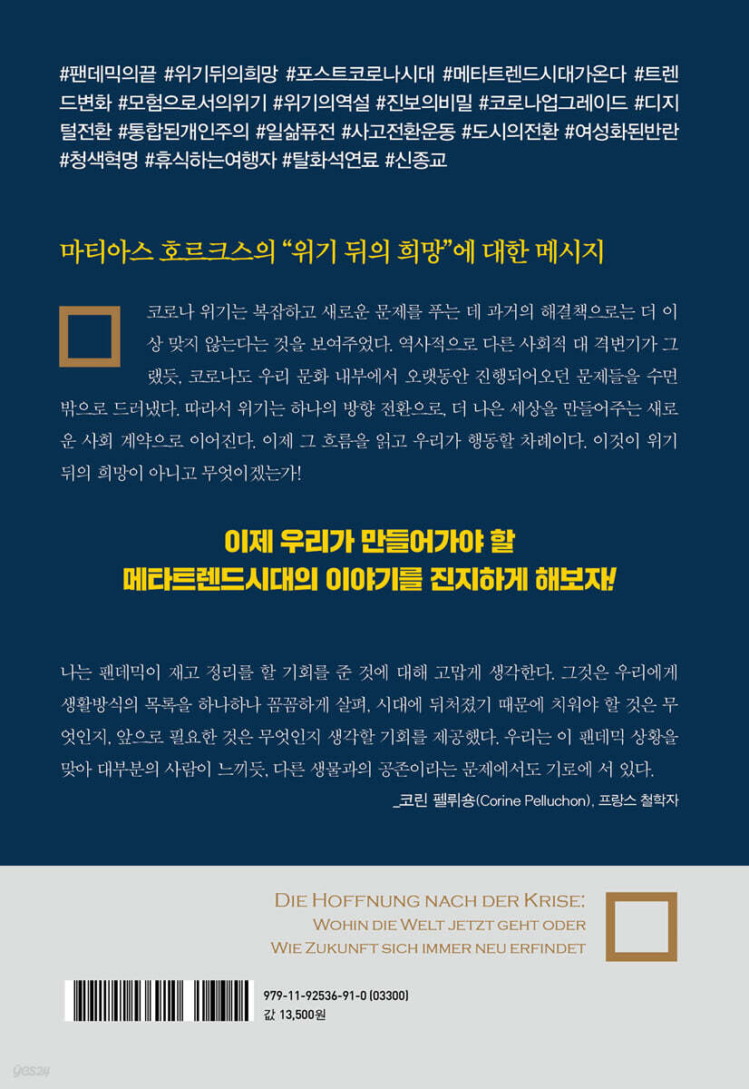 점입가경이다. 나아지는 듯했으나 다시 안개 속을 헤매고 있다. 인류의 역사 가운데 이렇게 오랜 기간 동안 해결책을 찾지 못하고 헤맨 적이 없다. 그래서 많은 전문가들이 인류를 코로나 이전(BC: Before Corona)과 코로나 이후(Post Corona)으로 나누는 데 별다른 이견을 달지 않는다. 코로나 바이러스는 인류의 삶과 생각을 혁명적으로 바꾸어 놓고 있다. 우리는 결코 코로나 이전의 삶으로 돌아갈 수 없을 것이다. 이전에 당연했던 것들이 앞으로는 당연하지 않을 것이다. 새로운 질서인 ‘뉴노멀’에 의해 살아가게될 것이다. 잿빛 전망과 우울한 시나리오가 지속되는 가운데 유럽 최고의 미래학자이며 트렌드 분석가인 마티아스 호르크스는 이 책을 통해 ‘위기 뒤에 찾아올 희망’에 대해 전망한다. 이번 위기는 기존 질서를 전복시킬 만한 파괴력을 지니고 있다. 이전에 인류가 겪었던 다른 위기에 비해 파괴력과 영향력이 훨씬 더 크다. 그래서 이 위기가 지나면 우리는 새로운 세상에 살게 될 것이다. 우리 그리고 미래 세대가 살아가게 될 세상은 어떤 모습일까? 위기는 경제를 변화시키고, 새로운 시대로 안내하며, 기존의 시스템을 완전히 새롭게 재구성할 수 있다. 르네상스, 계몽주의, 산업화시대, 소비사회, 그리고 POP 시대 등이 대표적인 사례다. 변화의 불씨는 이미 내부에 잠재되어 있던 것들이고, 위기는 잠재되어 있던 에너지를 폭발하게 하는 방아쇠이자 촉진제 역할을 한다. 코로나 위기 전부터 계속해서 인류의 커다란 숙제로 지적되어오던 문제들, 멈출 줄 모르는 경쟁 지상주의, 석유 에너지 고갈과 기후 온난화, 디지털 중독과 우울증과 번아웃으로 이어진 현대인들의 정신적인 문제들, 개인주의가 낳은 고립감과 양극화, 일과 삶의 균형을 빙자한 일과 삶의 파괴, ‘오버투어리즘’이라고까지 불렸던 과도한 여행과 그로 인한 갈등, 방향을 잃은 종교, 그리고 남녀 간의 극한 갈등과 대결… 이 책은 코로나 위기가 이러한 문제가 갈등 해결을 위한 실마리를 제공해줬다고 분석한다. 그래서 이 위기가 끝나면 새로운 질서가 만들어질 것이고, 그런 가운데 새로운 희망을 찾을 수 있을 것이라고 용기를 불어넣는다. 혁신은 파괴를 통해 가능하다. 이 책은 지금의 코로나 위기가 기존 질서를 파괴하고 있고, 그로 인해 혁신을 가속화시킬 수 있는 기회를 선사하고 있다고 진단한다. 이제 우리 앞에는 어떤 미래가 펼쳐질 것이며, 새로운 미래를 대비하기 위해 우리는 무엇을 준비해야 할까? |