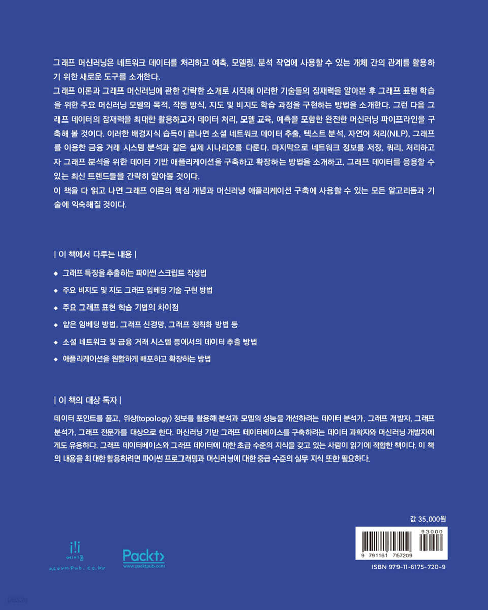이 책은 데이터 포인트를 풀고, 위상(topology) 정보를 활용해 분석과 모델의 성능을 개선하려는 데이터 분석가, 그래프 개발자, 그래프 분석가, 그래프 전문가를 대상으로 한다. 머신러닝 기반 그래프 데이터베이스를 구축하려는 데이터 과학자와 머신러닝 개발자에게도 유용하다. 그래프 데이터베이스와 그래프 데이터에 대한 초급 수준의 지식을 가지고 있는 사람이 읽기에 적합한 책이다. 이 책의 내용을 최대한 활용하기 위해서는 파이썬 프로그래밍과 머신러닝에 대한 중급 수준의 실무 지식 또한 필요하다. ㆍ 이 책의 구성 1장, '그래프 시작하기’에서는 NetworkX 파이썬 라이브러리를 사용해 그래프 이론의 기본 개념을 소개한다. 2장, ‘그래프 머신러닝’에서는 그래프 머신러닝과 그래프 임베딩 기술의 주요 개념을 소개한다. 3장, ‘그래프 비지도 학습’에서는 비지도 그래프 임베딩의 최신 방법을 다룬다. 4장, ‘그래프 지도 학습’에서는 지도 그래프 임베딩의 최신 방법을 다룬다. 5장, ‘그래프에서의 머신러닝 문제’에서는 그래프에서 가장 일반적인 머신러닝 작업을 소개한다. 6장, ‘소셜 네트워크 그래프’에서는 분석 소셜 네트워크 데이터에 머신러닝 알고리듬을 적용하는 방법을 소개한다. 7장, ‘그래프를 사용한 텍스트 분석 및 자연어 처리’에서는 자연어 처리 작업에 머신러닝 알고리듬을 적용하는 방법을 소개한다. 8장, ‘신용카드 거래에 대한 그래프 분석’에서는 신용카드 부정 거래 탐지에 머신러닝 알고리듬을 적용하는 방법을 소개한다. 9장, ‘데이터 드리븐 그래프 기반 응용 프로그램 구축’에서는 큰 그래프를 처리하는 데 유용한 몇 가지 기술을 소개한다. 10장, ‘그래프의 새로운 트랜드’에서는 그래프 머신러닝의 몇 가지 새로운 동향(알고리듬과 응용 프로그램)을 소개한다. ㆍ 지은이의 말 그래프 머신러닝은 네트워크 데이터를 처리하고 예측, 모델링, 분석 작업에 사용할 수 있는 개체 간의 강력한 관계를 활용할 수 있는 새로운 도구를 제공한다. 그래프 이론과 그래프 머신러닝을 간단하게 소개하고, 그래프의 잠재력을 이해하는 방법을 배운다. 이어서 그래프 표현 학습을 위한 주요 머신러닝 모델, 즉 목적과 작동 방식, 다양한 지도 학습과 비지도 학습 응용 프로그램에서 구현하는 방법을 익힌다. 그런 다음 그래프 데이터의 잠재력을 최대한 활용하고자 데이터 처리부터 모델 학습 그리고 예측을 포함한 완전한 머신러닝 파이프라인을 구축한다. 계속해서 소셜 네트워크 데이터를 수집하고, 텍스트 분석과 금융 거래 시스템, 자연어 처리와 같은 실제 시나리오를 다룬다. 마지막으로 네트워크 정보를 저장하고, 질의하고 처리하기 위한 그래프 분석용 데이터 기반 응용 프로그램을 구축하고 확장하는 방법을 배운 다음, 그래프의 최신 동향을 알아본다. 이 책을 통해 그래프 이론의 필수 개념과 머신러닝 응용 프로그램을 성공적으로 구축하는 데 사용되는 모든 알고리듬과 기술을 배울 수 있을 것이다. ㆍ 옮긴이의 말 처음 접하는 이들에게는 그래프 데이터가 어렵게 느껴질 수 있다. 하지만 그래프 데이터는 우리의 일상과 친숙해질 수 있는 데이터 형식이다. 사회는 복잡한 관계의 연속으로 구성되는데, 노드와 간선으로 표현되는 그래프 데이터는 이러한 관계의 표현을 가장 잘 나타낼 수 있는 데이터 형식이다. 관계 표현을 가장 쉽게 할 수 있다는 강점이 있어 최근에는 그래프 형식으로 데이터를 저장하는 데이터베이스 등이 각광받고 있다. 이 책은 그래프 데이터를 다루기 위한 아주 기본적인 것들로 시작해서, 실생활에 적용할 수 있는 예시를 통해 보다 쉬운 이해를 제공한다. 예시를 통해서 그래프 데이터를 다루는 기본기를 쌓고, 머신 러닝 알고리즘들을 활용해 고급 응용 스킬들을 배워볼 수 있다. 단순히 이론적인 설명에서 끝나는 것이 아니라 실제 서비스에 필요한 기본 지식들을 소개한다는 점에서 훌륭한 책이다. 물론 나와있는 내용만으로 그래프 머신 러닝 전문가가 될 수 있다고는 할 수 없을 것이다. 그러나 훌륭한 시작을 함께하기 위해 좋은 책이라고 생각한다. 이 책에서는 보다 복잡한 설명이나 심도 있는 이해가 필요한 부분에 참고할 만한 자료들에 대한 소개가 나와있다. 이러한 참고 자료들을 찾아보고 스스로 새로운 문제를 해결하기 위해 노력해보기를 꼭 권장한다. 이러한 노력이 인공지능 연구의 선도자가 되는 길이라고 생각한다. |