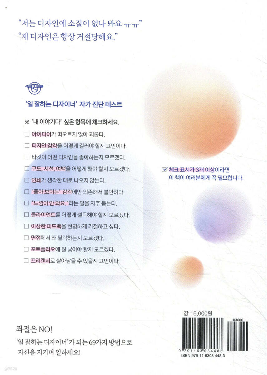 클라이언트 설득부터 면접 준비까지 모든 것을 담았다! 디자이너에게 필요한 능력은 어떤 것들이 있을까? 모든 일이 그러하듯이 디자인 역시 자신의 일만 잘한다고 해서 모든 문제가 해결되진 않는다. 클라이언트와 소통하는 방법도 알아야 하고, 자신의 커리어를 잘 드러내 포트폴리오를 만드는 방법도 알아야 한다. 그래야만 자신을 지키면서 디자이너로 계속 일할 수 있다. 유튜브 200편에 달하는 조언을 책으로! 어디에 물어보기 애매했던 고민과 감정까지 해소된다 이 책은 저자가 유튜브 채널에서 ‘초보 디자이너가 알아야 하는 것들’을 주제로 이야기한 200여 편의 영상을 바탕으로 만들어졌다. ‘아이디어가 떠오르지 않을 때’, ‘면접에서 자꾸만 떨어질 때’, ‘초보 디자이너가 가지기 쉬운 편견’ 등 먼저 겪은 진심 어린 조언뿐만 아니라, ‘인쇄 실수를 줄이는 방법’, ‘어도비 아크로벳 프로에서 인쇄용으로 적합한지 확인하는 방법’ 등 구체적인 실무 테크닉까지 망라한다. 이 책을 본 사람이라면 누구나 든든한 선배가 생긴 기분이 들 것이다. 문제를 대하는 현실적인 실천 방법은 물론, 실무 현장에서 느꼈던 감정과 생각이 ‘나 혼자만 겪는 게 아니었구나’라고 안도하면서 위로와 용기도 조금 얻을 수 있을 것이다. 디자이너에게 필요한 4가지 능력, 69가지 현실 조언으로 알려 준다 디자이너가 일을 잘한다는 건 어떤 걸까? 그런 능력은 어떻게 키울 수 있을까? 다소 추상적일 수 있는 ‘디자인 능력’을 저자는 4가지로 구분해 설명한다. 마음가짐, 실무 테크닉, 디자인 지식, 커리어 관리가 바로 그것이다. 초보 디자이너라면 한 번쯤 고민할 법한 주제를 다섯 파트로 나누어 총 69가지 조언으로 질문에 대답했다. 지금 자신이 처해 있는 상황을 찾아서 펼쳐 보아도 좋고, 처음부터 끝까지 가볍게 읽어도 출근하기 전 밀려오는 두려움에서 벗어날 수 있을 것이다. 〈이 책에 담긴 주요 내용〉 ㆍ 1%의 변화로 감각적인 디자인을 만드는 방법 5가지 ㆍ 디자인 감각을 기르는 방법 ㆍ 인쇄가 생각한 대로 나오지 않을 때 ㆍ 프리랜서가 일을 따오는 방법 ㆍ ‘좋아 보이는’ 감각에만 의존해 불안할 때 ㆍ 영문 글꼴로 뭘 써야 할지 모르겠을 때 ㆍ 프로 디자이너가 절대 해서는 안 되는 행동 5가지 ㆍ 디자인을 진행하다가 막혔을 때 대처 방법 ㆍ 디자이너가 빠지기 쉬운 ‘디자인 편견' ㆍ 지루한 디자인이 되지 않으려면? ㆍ “딱 이거다 싶은 느낌이 안 와요.”라는 말을 들었다면? ㆍ 감정적인 피드백에 대처하는 3가지 방법 ㆍ 의미 있는 피드백을 받는 3가지 요령 ㆍ 필요하지 않은 수정을 요구할 때 ㆍ 아무리 수정해도 끝나지 않는 이유 ㆍ 프리랜서로 살아남기 위해 갖춰야 할 3가지 ㆍ 포트폴리오를 만들 때 주의할 점 [이런 분께 추천해요!] ㆍ 디자이너가 꿈인 대학생, 취준생 ㆍ 초보 디자이너, 사수가 없어 막막한 실무자 ㆍ 프리랜서로 전향한 디자이너, N잡러 ㆍ 디자이너의 마음을 이해하고 싶은 협업자 |