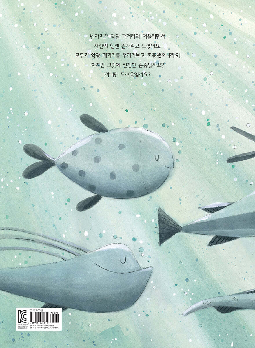 “서로가 서로를 친구로 존중해요.” 벤자민은 악당 무리에 들고 싶은 계획이 없었는데, 여럿이 함께하는 무리에 들어오라고 하니 우쭐한 기분을 느낍니다. 여럿이 있는 것만으로도 왠지 힘이 세진 듯한 착각이 들기 때문이지요. 벤자민은 이름 대신 11호라고 불립니다. 11호가 된다는 건 자신의 목소리를 내려놓고, 무리에 따르겠다는 뜻입니다. 이것도 나쁘지 않습니다. 무엇이든 깊게 생각할 필요 없이 10호 말만 잘 따르면 되니까요. 악당 패거리들은 뭐든 자기들 중심으로 행동합니다. 다른 물고기들을 내쫓고 해초를 독차지하기도 하고, 축구공을 뺏기도 합니다. 이유 없이 놀리기도 하고요. 자기들의 힘만 믿고요. 벤자민은 옛 친구들이 놀림받는 모습을 보고, 나쁜 행동을 하고 있음을 깨닫게 되지요. 벤자민은 11호로 있는 걸 그만두기로 합니다. 벤자민을 따라 3호도 8호도 5호도 그만두기로 합니다. 악당 패거리의 대장만 빼고 다른 물고기들 모두요. 새로운 무리가 생겨났습니다. 이번 무리는 악당 패거리와 달라요. 진짜 좋은 친구 사이는 무엇일까요? 지난 실수로 많은 걸 깨달은 벤자민과 친구들은 서로 존중하고 아끼는 게 얼마나 중요한지 알고 있지요! 물고기들을 보며 우리의 속마음을 나눠요! “무서워서 아무도 속마음을 드러내지 못했던 거예요.” 아이들은 서로 어울리며 때로는 싸우기도 하고 자신의 행동이 어떤 영향을 미칠지 모른 채 다른 아이를 괴롭히거나 따돌리기도 합니다. 때로는 장난으로 서로 상처를 주고받기도 하지요. 벤자민이 악당 패거리에 들어가서 행동한 것처럼요. 악당 패거리에 있는 물고기들을 살펴보면, 벤자민만 빼고 모두 푸르딩딩한 회색입니다. 솔직한 마음은 꽁꽁 감추며 센 척하는 속마음이 몸 색깔로 드러난 듯하지요. 벤자민이 못된 짓을 그만두겠다고 용기를 내고 뒤이어 물고기들이 악당 무리를 벗어났을 때 원래대로 다양한 몸 색깔을 되찾지요. 또한 활달한 표정과 몸짓도 되살아납니다. 물고기들의 모습은 실제 아이들의 생활 모습과 맞닿아 있습니다. 무리 안에서 눈치를 보는 물고기들의 표정, 몸짓이 많은 것을 이야기해 주지요. 그런 물고기를 보며 아이들은 저절로 자신의 모습을 돌아볼 수 있습니다. 친구를 괴롭히는 아이도, 괴롭힘을 당하는 아이도 사이좋게 지내고 싶은 속마음과 달리 어찌할지 몰라 행동하고 있을지 모릅니다. 『악당 11호』는 유쾌한 그림책이지요. 마치 숨은그림찾기를 하듯이 미묘하게 드러나는 물고기들의 몸 색깔, 표정, 몸짓의 변화를 얘기해 보세요. 미처 말하지 못했던 여린 속마음을 알아차리고, 서로 좋은 친구가 될 수 있는 기회가 되면 좋겠습니다. |