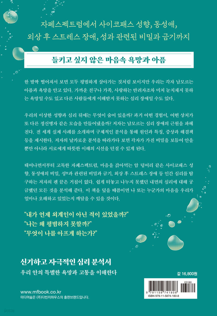 나무 그림을 통해 분석해보는 인간의 심리 “지금 바로 A4지 한 장을 꺼내놓고 그저 손 가는 대로 나무 한 그루를 그려보자. 어떻게 그려도 상관없으니 그리고 싶은 대로 마음껏 그리면 된다.” 자, 이제 내면 심리를 탐구할 모든 준비는 끝났다. 저자는 각자가 그린 나무 그림을 통해 내면에 존재하는 세 개의 자아인 이드, 에고, 슈퍼에고가 어떻게 서로를 견제하며 우리의 마음을 형성하는지를 설명한다. 저자의 글은 너무 쉬우면서도 흥미로워서 그저 따라가면서 읽다 보면 모든 것이 저절로 이해될 정도다. 세 개의 자아는 서로를 괴롭히면서 불안이라는 감정을 만들어낸다. 불안은 인류의 오랜 진화 과정을 이끌어온 근본적인 정서다. 구체적이고 현실적인 불안은 두려움으로 발현되고, 본능인 이드와 현실적 자아가 갈등할 때 발생하는 신경증적 불안은 주체할 수 없는 감정으로 폭발한다. 이드와 초자아 사이에서 끊임없이 시달리는 자아는 마치 회사의 중간 계층과 같아서 어떤 때는 부하(이드)와의 관계를 제대로 처리하지 못해 고위 간부(초자아)로부터 질책을 받는다. 그럴 때 느끼는 수치심과 양심의 가책이 도덕적 불안으로 나타난다. 저자의 설명을 통해 우리는 항상 자신을 괴롭히던 불안의 본질을 이해하고 넘어설 수 있다. 이렇게 심리에 대한 기본적인 이해로 시작하여 점차 정상과 비정상의 경계에 선 다양한 심리를 탐구해 들어간다. 오해와 편견 속에 갇힌 욕망과 심리 장애 그 내밀한 심리를 파헤친다 저마다 자신만의 욕망과 상처, 그리고 감추고 싶은 비밀이 있다. 사람은 모두 물려받은 천성, 성장 배경, 유년기의 경험과 상처 등이 다르기 때문이다. 한편으로 인간은 수많은 타인과 뒤섞이고 어우러져 살아야 하는 사회적 존재다. 그래서 남과는 다른 것 같은 자신의 내면을 숨기며 살아가는 것이 결코 쉽지만은 않다. 주변을 살펴보면 모두가 멀쩡한 얼굴로 평범한 일상 속에서 행복한 삶을 살아가는 것처럼 보이지만 마음속 기이한 성향이나 심리 장애로 이해받지 못하는 고통과 두려움을 겪기도 한다. 잘 몰라서, 잘못된 정보로 인한 편견 때문에 나 혹은 타인의 심리적 고통을 외면하지는 않았는가. 심리학 분야 베스트셀러 저자이자 심리학자인 저자는 다양한 인간 군상을 이해하기 위해서는 인간 심리의 비밀을 알아야 한다고 말한다. 나와 다르다고 해서 비정상은 아니다. 서로의 다름을 인정하고 따뜻한 시선으로 바라볼 수 있으려면 인간의 심리에 대한 충분한 이해와 통찰이 먼저다. 이 책에는 그간 잘 다루지 않았던, 터놓고 얘기하지 못했던 욕망과 심리 장애가 담겨 있다. 태어나면서부터 고독한 자폐스펙트럼, 마음을 갉아먹는 암 덩어리 같은 사이코패스 성향, 동성애의 비밀, 성(性)과 관련된 비밀과 금기, 외상 후 스트레스 장애까지 그 원인과 증상, 실제 사례를 분석해놓았다. 예를 들어 사이코패스에서는 미국의 악명 높은 연쇄살인범 제프리 다머의 사례를 다룬다. 무엇이 그를 바꾸었는지, 그가 왜 잔혹한 살인을 저질렀는지, 그의 심리가 어떻게 진행되었는지를 생생하게 보여준다. 끔찍한 사건들은 흥미로우면서도 인간 심리의 극단을 보여주기도 한다. 이 책에서 다루는 심리적 장애나 욕망의 주인공은 나일 수도 타인일 수도 있다. 저자의 날카로운 심리 분석을 통해 인간 심리를 깊이 통찰하는 기회가 될 것이다. |