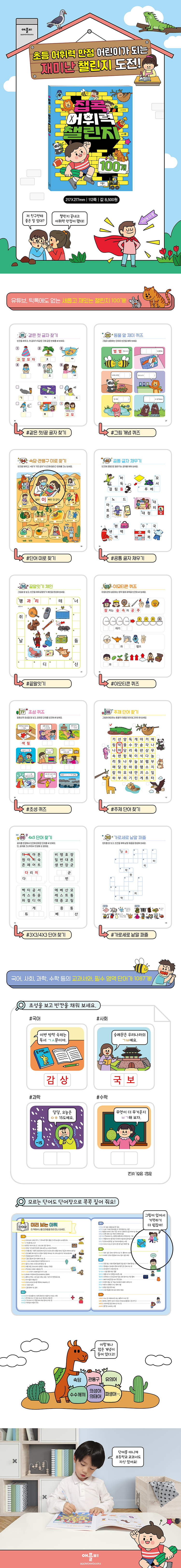 같은 첫/끝 글자 찾기, 그림 개념 퀴즈, 이모티콘 퀴즈, 단어 미로 찾기, 공통 글자 채우기, 끝말잇기, 초성 퀴즈, 주제 단어 찾기, 3X3/4X3 단어 찾기, 가로세로 낱말 퍼즐 등이 들어 있어요. 익숙한 단어 퍼즐부터 아주 새롭고 재밌는 퍼즐까지 풀어 보세요! 2. 국어, 사회, 과학, 수학 등 초등 교과서와 필수 영역 단어 1087개! 어휘력은 모든 초등 공부의 기본이에요. 아이들은 아무리 쉬운 개념이어도 모르는 단어로 설명되어 있으면 어렵다고 느끼지요. 따라서 아는 단어가 많을수록 말하고, 듣고, 읽고, 쓰고, 이해하는 학습 능력이 커져요. 이 책에는 다양한 과목과 필수 영역에서 쏙쏙 뽑은 단어 1087개가 들어 있어요. 챌린지를 끝내면 어휘력이 탄탄해질 거예요. 3. 다양한 초등 국어 개념이 쏙! 재밌는 퍼즐로 구성된 챌린지에는 다양한 초등 국어 개념이 들어 있어요. 챌린지를 꾸준히 하다 보면 자연스럽게 속담, 관용구, 동음이의어, 반대말, 의성어, 의태어, 유의어, 파생어 등의 개념을 익힐 수 있지요. |
