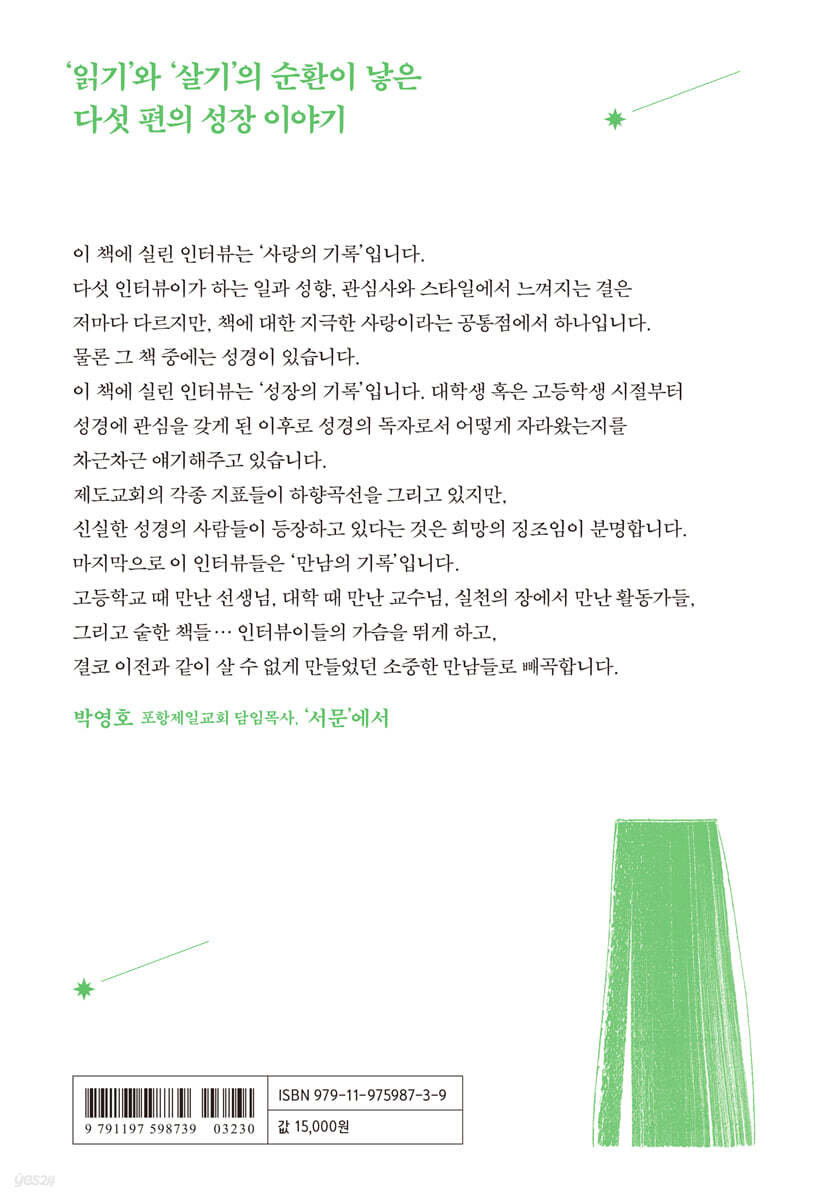 이 책에 실린 인터뷰는 ‘사랑의 기록’입니다. 다섯 인터뷰이가 하는 일과 성향, 관심사와 스타일에서 느껴지는 결은 저마다 다르지만, 책에 대한 지극한 사랑이라는 공통점에서 하나입니다. 물론 그 책 중에는 성경이 있습니다. 이 책에 실린 인터뷰는 ‘성장의 기록’입니다. 대학생 혹은 고등학생 시절부터 성경에 관심을 갖게 된 이후로 성경의 독자로서 어떻게 자라왔는지를 차근차근 얘기해주고 있습니다. 제도교회의 각종 지표들이 하향곡선을 그리고 있지만, 신실한 성경의 사람들이 등장하고 있다는 것은 희망의 징조임이 분명합니다. 마지막으로 이 인터뷰들은 ‘만남의 기록’입니다. 고등학교 때 만난 선생님, 대학 때 만난 교수님, 실천의 장에서 만난 활동가들, 그리고 숱한 책들… 인터뷰이들의 가슴을 뛰게 하고, 결코 이전과 같이 살 수 없게 만들었던 소중한 만남들로 빼곡합니다.