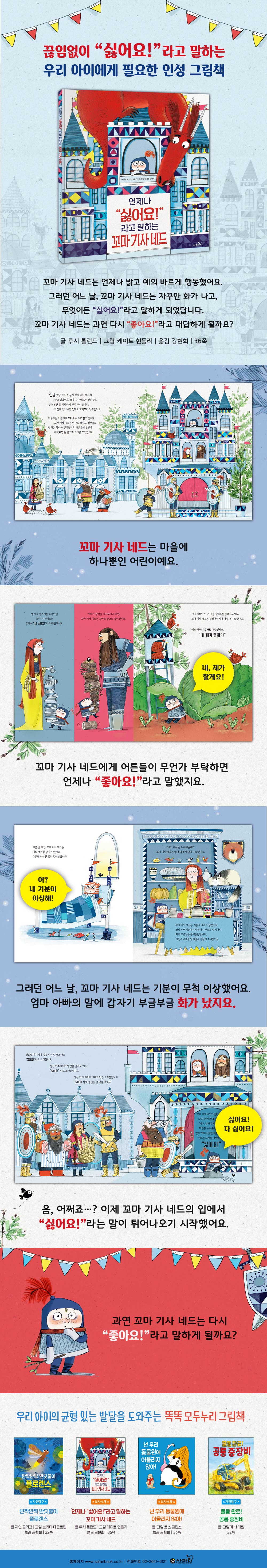 꼬마 기사 네드는 언제나 밝고 예의 바르게 행동했어요. 그러던 어느 날, 꼬마 기사 네드는 자꾸만 화가 나고, 무엇이든 “싫어요!”라고 말하게 되었답니다. 꼬마 기사 네드는 과연 다시 “좋아요!”라고 대답하게 될까요?