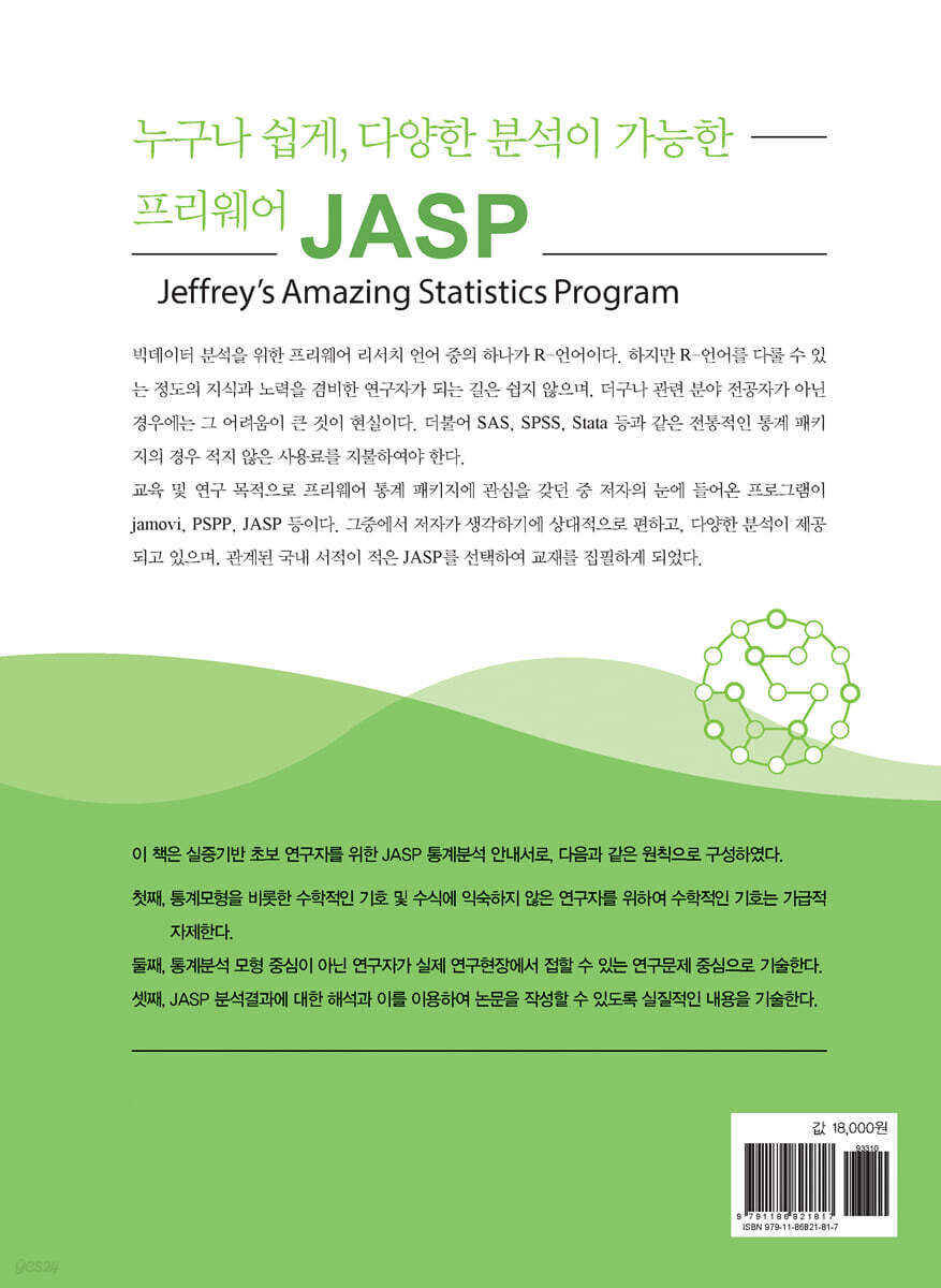 빅데이터 분석을 위한 프리웨어 리서치 언어 중의 하나가 R-언어이다. 하지만 R-언어를 다룰 수 있는 정도의 지식과 노력을 겸비한 연구자가 되는 길은 쉽지 않은 길이며, 더구나 관련 분야 전공자가 아닌 경우에는 그 어려움이 큰 것이 현실이다. 더불어 SAS, SPSS, Stata 등과 같은 전통적인 통계 패키지의 경우 적지 않은 사용료를 지불하여야 하는 실정이다. 사용료를 지불할 수 있는 규모의 대학, 연구소 등에 근무하거나 소속된 연구자의 경우에는 문제가 되지 않지만, 그런 환경에 처해있지 않은 연구자의 경우 매우 어려움이 큰 현실이다. 저자가 근무하고 있는 대학 또한 규모가 작기 때문에 최신 버전의 통계소프트웨어를 구비할 수 없는 재정의 현실적인 어려움이 있는 실정이다. 이로 인하여 교육 및 연구 목적으로 프리웨어 통계패키지에 관심을 갖던 중 저자의 눈에 들어온 프로그램이 jamovi, PSPP, JASP 등이다. 그 중에서 저자가 생각하기에 상대적으로 편하고, 다양한 분석이 제공되고 있으며, 관계된 국내 서적이 적은 JASP를 선택하여 교재를 집필하게 되었다.