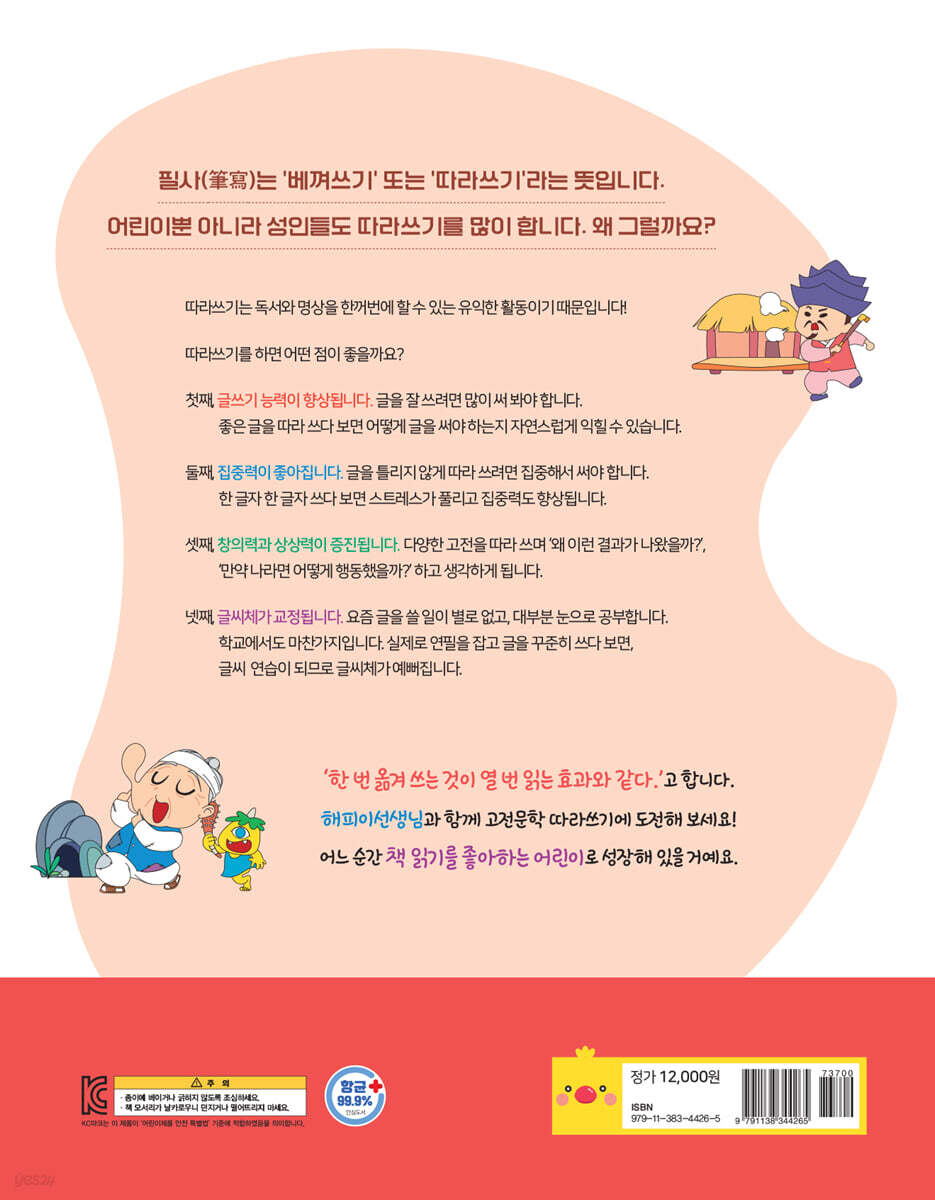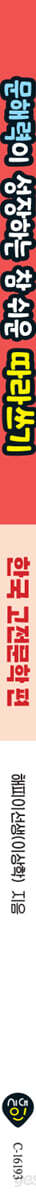 ★ 글쓰기 향상: 또박또박 읽고 따라 쓰면 글쓰기가 쉬워져요. ★ 집중력 강화: 눈으로만 읽고 대충 쓰는 습관을 바로잡을 수 있어요. ★ 창의력 증진: 이야기 속 장면들을 상상하면서 따라 쓰면 창의력이 쑥쑥 자라요. ★ 글씨체 교정: 바른 자세로 손에 힘을 주고 따라 쓰면 글씨를 예쁘게 쓸 수 있어요. 책 읽기와 글쓰기를 싫어하는 아이들과 자녀의 문해력 향상을 바라시는 부모님들에게 초등 교사 해피이선생님이 쓴 『문해력이 성장하는 참 쉬운 따라쓰기 - 한국 고전문학 편』을 강력히 추천합니다. 책 읽기와 글쓰기를 한 번에! 우리 아이들이 부모님께 자주 듣는 말은 무엇일까요? 아마도 “책 좀 읽어!”가 아닐까 싶습니다. 우리 아이들은 책을 읽는 것보다 스마트폰 게임이나 유튜브 영상을 보는 것이 훨씬 재미있고 즐겁습니다. 한편, 우리 아이들이 숙제를 하거나 문제집을 풀 때 부모님들은 “글씨 좀 예쁘게 써라!” 하고 말씀하십니다. 그런데 요즘 아이들은 글씨를 쓸 일이 별로 없기 때문에 글씨를 예쁘게 쓰고 싶어도 쉽지 않습니다. 부모님이 우리 아이들에게 바라는 책 읽기와 글씨 예쁘게 쓰기는 따라쓰기를 통해 해결할 수 있습니다. 책을 읽고, 그 내용을 따라 쓰는 것을 통해 책 읽기와 글씨 연습을 한꺼번에 할 수 있기 때문입니다. 바른 공부 습관에 도움이 되는 따라쓰기!! 글을 읽을 때 문장의 흐름을 이해하지 못하거나 맞춤법과 띄어쓰기를 알지 못해 글쓰기를 잘하지 못하는 아이들은 국어뿐만 아니라 다른 과목에서도 그 내용을 이해하는 데 어려움을 겪을 수 있습니다. 게다가 서술형 문제의 출제 비중이 점점 늘어나는 요즘, 문제를 제대로 이해하지 못해서 풀지 못하는 경우도 있습니다. 이러한 문제점을 한국 고전문학 34개 작품을 읽고, 따라쓰기를 하는 과정을 통해 해결할 수 있습니다. 『문해력이 성장하는 참 쉬운 따라쓰기 - 한국 고전문학 편』을 통해 아이가 자기주도적으로 언어 능력을 키울 수 있도록 해 주시길 바랍니다. |