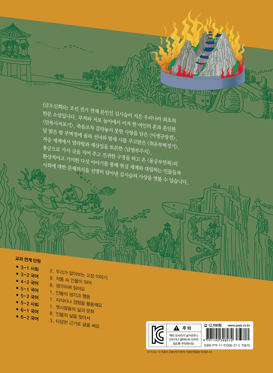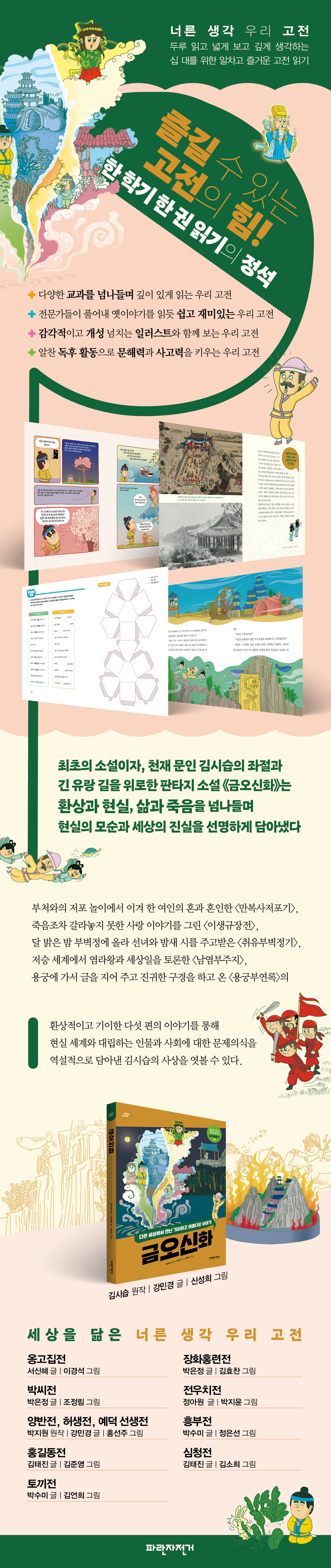 1. 『금오신화』는 어떤 책인가요? 2. 『금오신화』인데 왜 소설이라고 하나요? 3. 『금오신화』를 지은 김시습은 어떤 사람인가요? 4. 『금오신화』와 『전등신화』가 비교되는 이유가 무엇인가요? 5. 『금오신화』에 들어 있는 한시는 어떤 의미와 가치가 있나요? 6. 『금오신화』에 담긴 소설은 어떤 내용인가요? 7. 「이생규장전」에서 홍건적이 쳐들어온 일은 무슨 사건인가요? 8. 김시습은 『금오신화』의 주인공을 통해 무엇을 말하고 있나요? 금오신화 -만복사에서 저포 놀이 한 이야기 「만복사저포기」 부처님과의 저포 놀이 임과의 즐거운 한때 짧은 행복 긴 이별 -이생이 담 너머를 엿본 이야기 「이생규장전」 담 너머 만난 인연 어렵게 성사된 혼사 죽음도 넘어선 사랑 -부벽정에서 취해 즐긴 이야기 「취유부벽정기」 부벽정 달빛 아래 선녀와 나눈 시 신선이 된 홍생 -남쪽 저승을 구경한 이야기 「남염부주지」 지옥에 간 박생 염라와의 만남 한숨 나는 세상 도리 염부주의 새로운 왕 -용궁 잔치에 초대받은 이야기 「용궁부연록」 용궁에서 온 초대장 상량문을 지어 올리다 흥겨운 용궁 잔치 신기한 용궁 구경 지리 시간에 금오신화 읽기 1. 『금오신화』를 지은 금오산실은 어디에 있나요? 2. 「만복사저포기」의 배경이 되는 만복사는 어디에 있나요? 3. 홍건적이 쳐들어왔을 때 임금은 왜 복주로 피란 갔나요? 4. 「이생규장전」의 배경이 되는 송도 낙타교는 어떤 곳인가요? 5. 「취유부벽정기」의 배경이 되는 평양 부벽정은 어떤 곳인가요? 6. 「남염부주지」에서 박생이 다녀온 남염부주는 어떤 곳인가요? 7. 「용궁부연록」에서 한생이 살던 개성은 무엇이 유명한가요? 독후활동지 : 금오신화 읽고 생각을 넓혀요 |