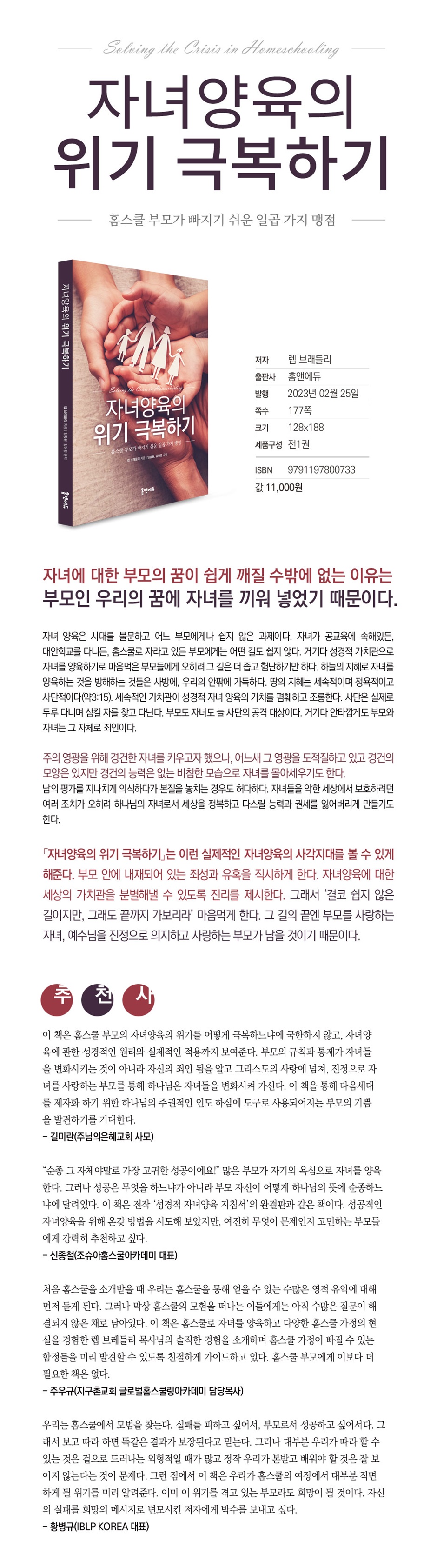 제2장 우상으로 변한 가정 제3장 겉모양만 지나치게 강조하기 제4장 쉽게 다른 사람들을 판단하는 마음 제5장 권위와 통제에 지나치게 의존하는 경향 제6장 과잉보호 1. 보호를 넘어 공급으로 2. 보호를 넘어 세상 속으로 (1) 보호를 넘어 하나님, 하나님의 말씀, 하나님 나라를 가르쳐라 (2) 보호를 넘어 순전한 믿음을 전수하라 (3) 보호를 넘어 세상으로 내보내라 (4) 수비수가 아니라 공격수로 키워라 (5) 자녀들과 사랑의 관계를 구축하라 (6) 부모와 관계 속에서 안정감을 찾게 하라 제7장 관계를 망치는 방법론적 자녀양육 1. 온전한 인격체인 우리 자녀들 2. 관계성이 깨지는 이유 3. 자녀들의 마음에 영향을 미치는 것 4. 자녀들의 마음을 부모에게로 돌이키기 5. 예수님을 바라보기 |