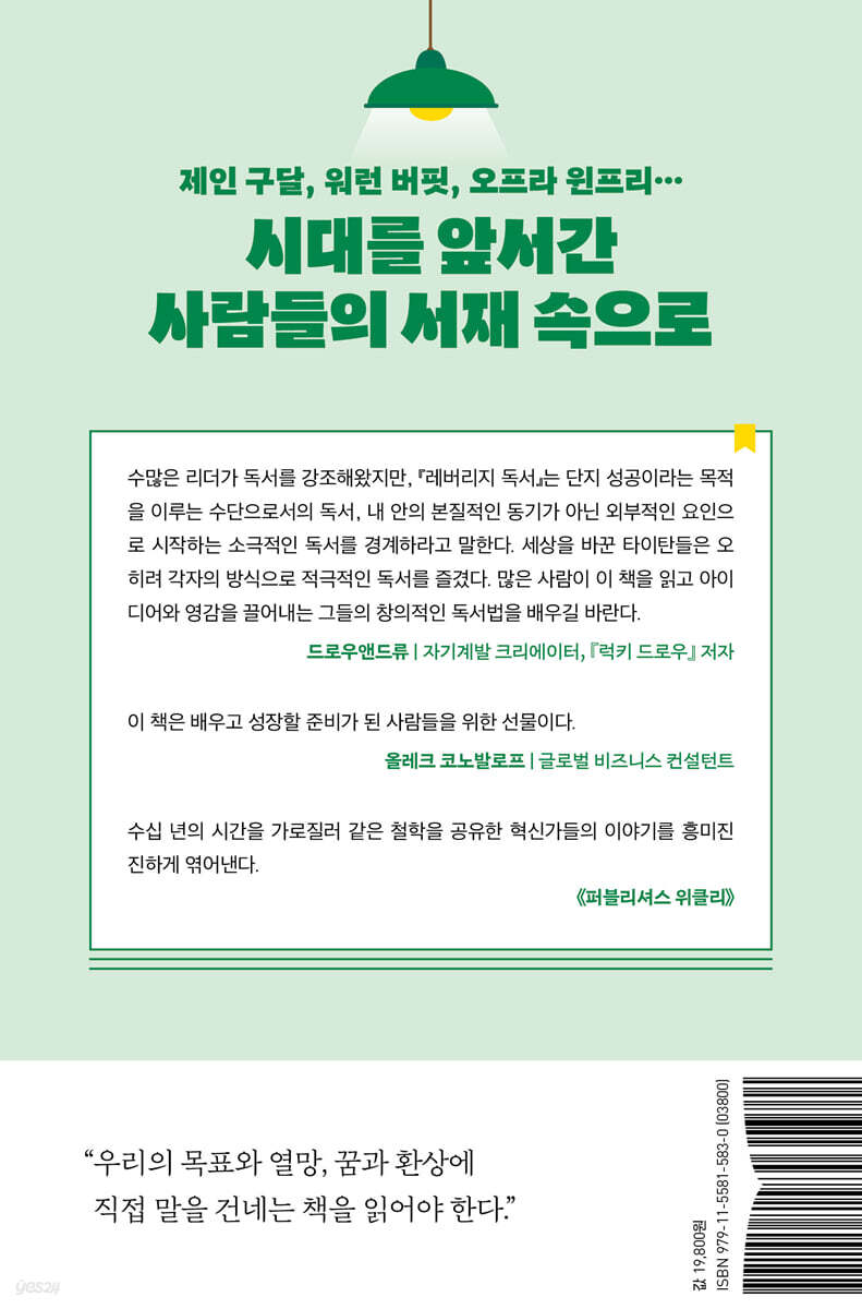 수많은 리더가 독서를 강조해왔지만, 『레버리지 독서』는 단지 성공이라는 목적을 이루는 수단으로서의 독서, 내 안의 본질적인 동기가 아닌 외부적인 요인으로 시작하는 소극적인 독서를 경계하라고 말한다. 세상을 바꾼 타이탄들은 오히려 각자의 방식으로 적극적인 독서를 즐겼다. 많은 사람이 이 책을 읽고 아이디어와 영감을 끌어내는 그들의 창의적인 독서법을 배우길 바란다. - 드로우앤드류 (자기계발 크리에이터, 『럭키 드로우』 저자)