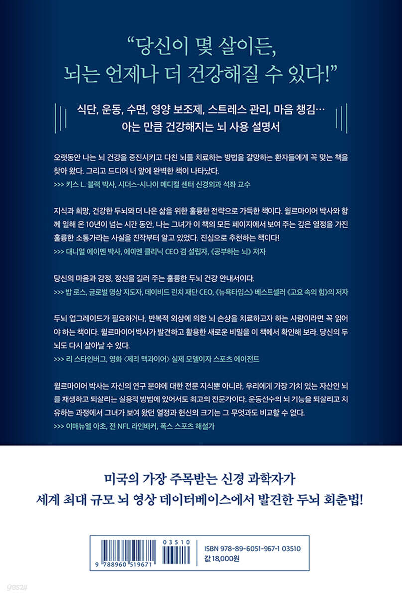 지식과 희망, 건강한 두뇌와 더 나은 삶을 위한 훌륭한 전략으로 가득한 책이다. 윌르마이어 박사와 함께 일해 온 10년이 넘는 시간 동안, 나는 그녀가 이 책의 모든 페이지에서 보여 주는 깊은 열정을 가진 훌륭한 소통가라는 사실을 진작부터 알고 있었다. 진심으로 추천하는 책이다! - 대니얼 에이멘 (박사, 에이멘 클리닉 CEO 겸 설립자, 『공부하는 뇌』 저자)