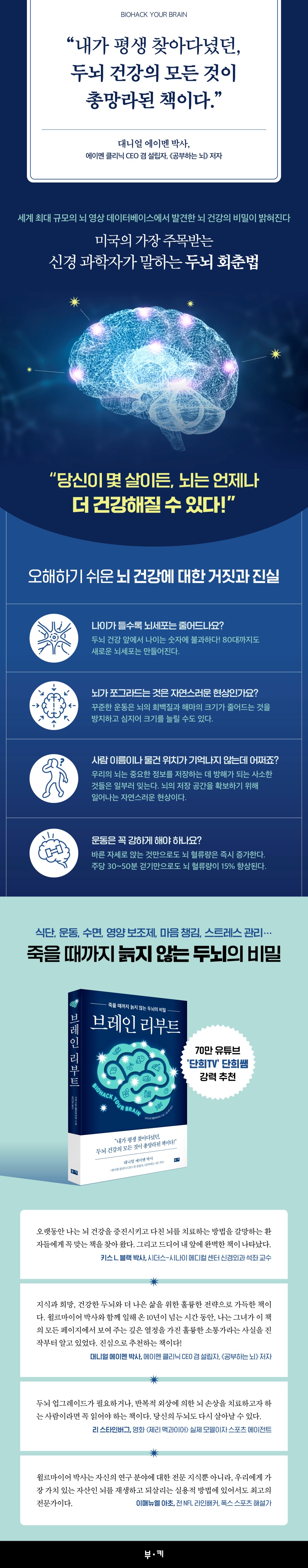 오랫동안 나는 뇌 건강을 증진시키고 다친 뇌를 치료하는 방법을 갈망하는 환자들에게 꼭 맞는 책을 찾아 왔다. 그리고 드디어 내 앞에 완벽한 책이 나타났다. - 키스 L. 블랙 (박사, 시더스-시나이 메디컬 센터 신경외과 석좌 교수)