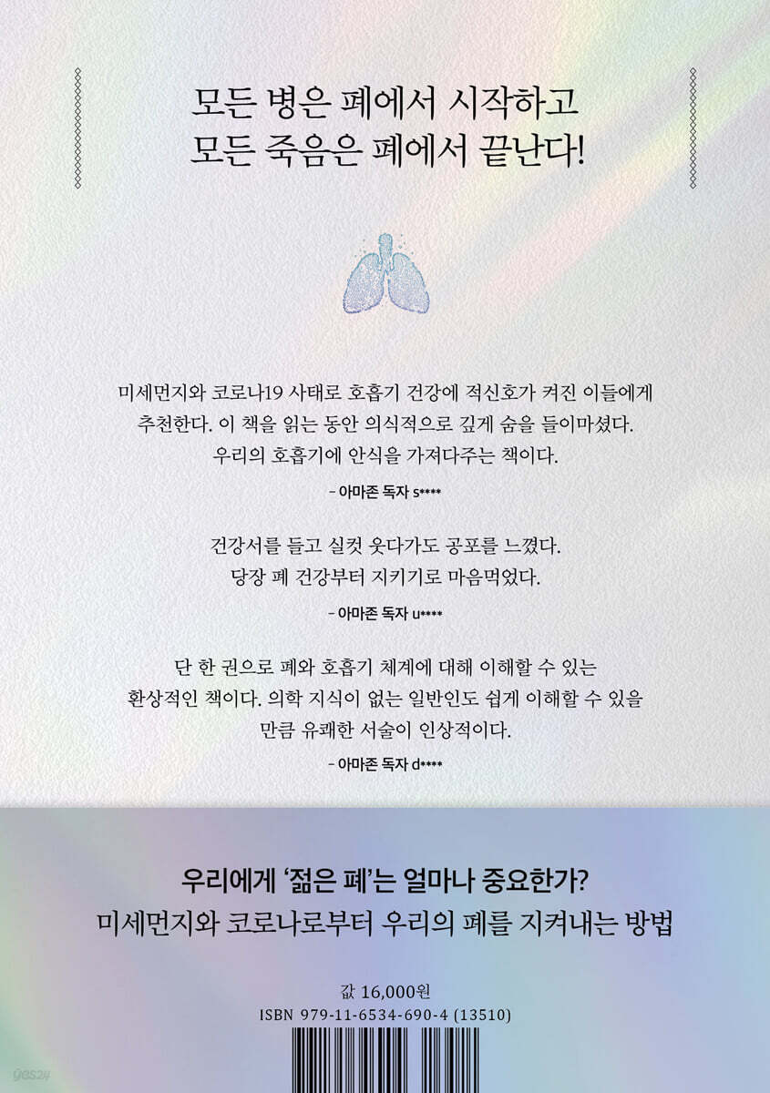프롤로그. 먼저 깊게 숨을 들이마시세요 Part 1. 숨쉬기의 과학 1. 폐의 설계와 구조 “무엇이 좀 보이나요?” “네, 신기한 것들이 많아요!” 우리가 호흡하는 통로 폐와 그 이웃들 정신 나간 연구자들? 시체로 자동차 안전 실험! 숨쉬기를 돕는 늑간근과 횡격막 2. 호흡기 탄생의 비밀 폐의 보호는 자궁에서부터 폐만을 위한 경호원 호흡 경로를 지켜주는 후두 3. 폐의 면역체계 벼락치기 하는 면역방어 다양한 세포 직원들 반갑거나 반갑지 않은 동거자 알레르기 없는 카렐리야인 새로운 사고의 단초 Part 2. ‘젊은 페’의 이해 4. 호흡의 단순한 일상 뇌가 호흡을 통제하는 법 한 편의 짧은 호흡 이야기 폐의 정화 기능, 점액섬모청소기관 5. 통증을 느끼지 못하는 폐 기침, 외로워지는 지름길 우리의 가래가 고백하는 것은 산 채로 매장? 호흡곤란! 6. 환경오염이 미치는 영향 흡연, 죽음의 숨결 사막 위의 하늘 지구온난화의 악몽 거꾸로 가는 길은 없다 폐 노화의 3가지 징후 Part 3. 병의 시작, 죽음의 끝 7. 다양하고 흔한 폐의 질환 감기로 죽는 사람들 병균을 혈액으로 넘기는 폐렴 천식의 90%는 알레르기성이다 8. 생명에 위협적인 폐의 질환 폐암은 조기진단이 관건 아, 이름이 뭐라고 했죠? 너무나도 조용히 죽어가는 폐 9. 호흡이라도 늙지 않으려면 약간의 오염도 감수하지 마세요 규칙적인 사우나 폐에 좋은 식품들 염증을 줄이는 운동법 힘 빼고 호흡하세요 에필로그. 마지막으로 크게 숨을 내쉬세요 참고문헌 |