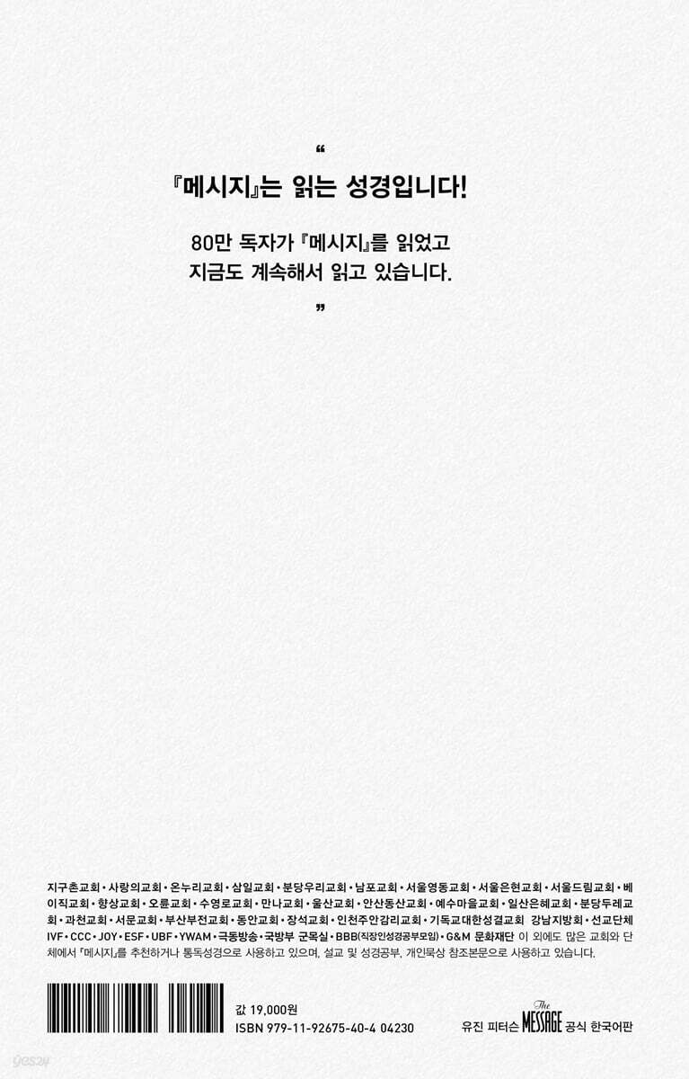 『메시지』는 변함없는 진리의 말씀을, 지금 이 시대의 평범하고 일상적인 단어들에 담아 생동감 있게 전해 줍니다. 성경의 원문에 충실한 바른 번역이 살아 있는 언어로 더욱 빛을 발하는 『메시지』는, 성경을 처음 읽는 사람이든 오랫동안 상고해 온 사람이든, 누구에게나 깊이 파고드는 생명력 있는 진리의 귀한 통로가 될 것입니다. 이 시대의 젊은이와 미래를 이끌어 갈 다음 세대에게 생명을 살리는 도구로 크게 쓰일 것입니다. - 오정현 (목사, 사랑의교회)