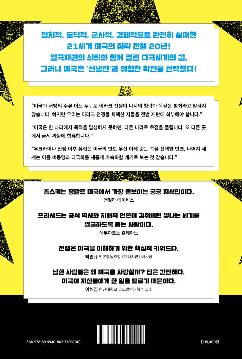 ‘언론이 감춘 빛나는 세계를 발굴하는 사람’의 만남 그 이름만으로도 충분한 신뢰감을 주는 시대의 양심, 노엄 촘스키 MIT 명예교수가 새로운 대담집을 내놓았다. 1960년대 베트남전쟁 시기 유명한 연설문이자 에세이 〈지식인의 양심〉을 발표한 이래 그는 60여 년에 가까운 긴 시간 동안 수많은 글, 강연, 대담을 통해 “완고한 장거리 달리기 선수”처럼 꾸준하게 세계와 권력, 진실과 정의에 관해 이야기해왔다. 단단한 바위 같은 그의 행보는 “지구상에서 가장 널리 읽히는 대외정책 비판자”(뉴욕타임스북리뷰)로 그를 대중 속에 자리매김했다. 하지만 95세의 촘스키 교수는 여전히 현장의 전선에 있다. 이번에는 1990년대 초 처음으로 그를 찾아와 자문을 구하며 인연을 맺은 후 30년간 전 세계를 무대로 비판적 저널리즘을 구현하며 자연스레 그의 ‘제자’이자 ‘동료’가 된 인도 출신의 저널리스트 비자이 프라샤드와 함께했다. 비판지성 촘스키의 출발점인 베트남과 라오스에서의 미국의 전쟁에 대한 비판에서 시작하여, 아프가니스탄, 이라크, 리비아에서의 미국의 21세기 20년 전쟁을 집중적으로 파헤쳤다. 현실로 펼쳐진 미국발 ‘신냉전’과 우크라이나 전쟁을 통해 세계의 미래를 전망했다. 지금 시기 우리에게 너무나 절박한 세계패권과 국제질서 문제에 대한 진실과 통찰에 대해 이야기한 것이다. 미국의 전쟁을 ‘불량국가의 테러리즘’이라는 방향에서 자신의 실천 행동까지 가미해 풀어내고 완결성 있게 정리해낼 지구인은, 단언컨대 노엄 촘스키 단 한 명뿐이다. 라틴아메리카의 거장 이야기꾼 에두아르노 갈레아노로부터 “언론과 공식 역사가 감춘 빛나는 세계를 발굴하는 사람”이라는 극찬을 받은 저널리스트답게, 비자이 프라샤드는 때로는 존경심을 담아 촘스키의 비판지성사를 복기하고, 때로는 촘스키의 숨겨졌던 인간적 면모를 드러내며, 때로는 자신의 날카로운 견해를 밝히면서 대담을 풍성하게 만든다(프라샤드가 촘스키에게 헌정한 ‘나가며’ 글은 가슴 뭉클하기까지 하다). 이 책이 특별하게 느껴지는 이유다. “그들이 미국을 싫어하는 건, 미국이 그들에게 한 일 때문이다.” - 21세기 미국의 침략 전쟁 실패사失敗史 “파란 눈과 금발”을 가지지 않은 “갈색 사람들”이기 때문일까. 보수적으로 추산하더라도 수십만 명이 목숨을 잃고 수백만 명이 기아와 빈곤에 노출된 결과로 귀결된 21세기 미국의 20년 전쟁은 여전히 제대로 인식되지 않았다. 특히 미국의 영향권에 있는 나라와 지역들에서 그러하다. 이 책에서는 결국 친미 정부 수립에조차 실패한 아프가니스탄(2장), 이라크(3장), 리비아(4장) 전쟁의 핵심을 비판적으로 복기한다. 정치적 목표가 결국은 달성되지 못했고, 도덕적으로 추악하며, 군사적으로 실패했고, 경제적으로도 명확한 결과를 말할 수 없는 총체적으로 실패한 전쟁이며, “그들이 미국을 싫어하는 건” 그럴 만한 충분한 이유가 있다는 것이다. 아프가니스탄에 대한 미국의 불법적인 침략과 끔찍한 잔학 행위는 9-11 테러를 ‘핑계’로 시작됐다. 사실 1980년대 아프가니스탄의 좌파 개혁 정권과 소련을 무너뜨리기 위해 무자헤딘 세력을 지원해 ‘수렁’을 만들었던 것도 미국이었다. 9-11의 진상 규명, 테러리스트의 실질적인 검거보다도 미국이 관심을 가졌던 것은 패권을 위한 전쟁 기획이었다. 9-11과 별다른 관계가 없었던 탈레반 정권과 아무런 관계가 없었던 아프가니스탄 국민들이 참화에 빠졌다. (특히 1980년대에 이루어진) 일체의 개혁과 진보는 사라졌고, 군벌과 봉건 세력이 ‘친미’의 이름으로 권좌를 차지했다. “전략적 이해관계조차 확실하지 않은” 아프가니스탄에서 미국이 벌인 행동은 마피아적 세계 질서 유지를 위한 “힘의 과시” 외에는 아무것도 아니었다. 그 과정에서 “부패”와 “탐욕의 전시실”이 아프간 친미 정부를 통해 펼쳐졌고, 군대는 붕괴했다. 아프간 국민들은 ‘개혁 정권 시절에는 여성이 취직을 하고 아이들이 거리에서 뛰어 놀았’으며 ‘심지어 탈레반도 이 정도는 아니었다’며 미국과 친미 세력에 대한 환멸과 분노를 이야기했다. 결국 마지막에는 제대로 된 싸움 한 번 없이 카불을 탈레반이 점령하고 미군은 철수하게 되었다. 이라크 전쟁에는 미국의 네오콘이 앞장섰다. 그들은 “새로운 미국의 세기”를 건설할 열망으로 “좋은 구실을 찾아 신속하게 휩쓸어 버릴 표적”이 필요했고, 그 대상으로 지목된 것이 한때 이란을 공격하기 위해 아주 친밀한 관계를 맺었던 이라크의 후세인 정권이었다. 이라크의 ‘대량살상무기’ 보유 가능성을 이유로 미국의 대량살상무기가 이라크에 투입됐고, 그것이 거짓 정보임이 드러나자 “자유”를 진척시키기 위해 “전쟁을 해야” 한다는 논리가 이어졌다. 수많은 서방 지식인들이 ‘보호책임’이라는 이름 아래 미국의 전쟁 논리에 호응했다. 전쟁과 ‘분할 지배’로 인해 시아-순니 종파 갈등이 사실상 처음으로 폭력적인 형태로 비화됐다. 미국의 입장에서 일극패권 확립, 석유 지배, 이스라엘 보호 및 이란 견제 등의 “전략적” 이유가 명확했던 이라크 전쟁은, 하