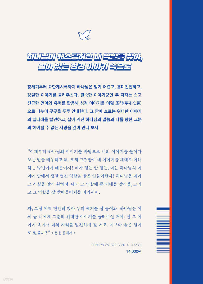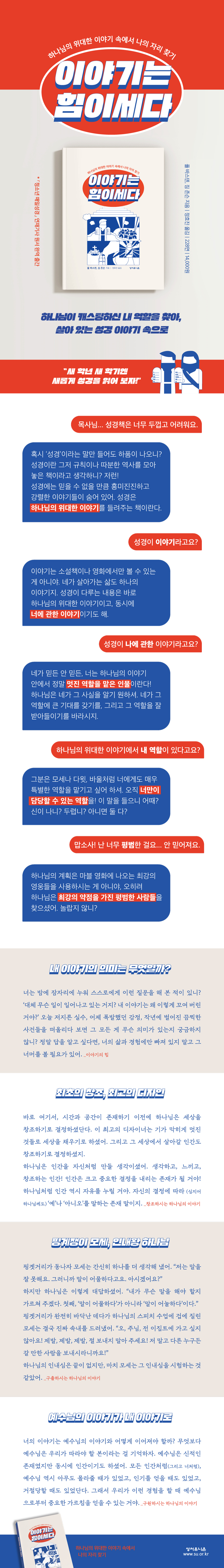 혹시 ‘성경’이라는 말만 들어도 하품이 나오니? 성경이란 그저 지켜야 할 규칙이나 따분한 옛날이야기를 모아 놓은 책이라고 생각하니? 저런! 그렇다면 이제 비밀 하나를 알려 줄게. 성경에는 믿기지 않고 흥미진진하고 강렬한 이야기들이 숨어 있어. 네가 발견해 주기만 기다리고 있지. 성경은 하나님의 위대한 이야기를 들려주는 책이란다.