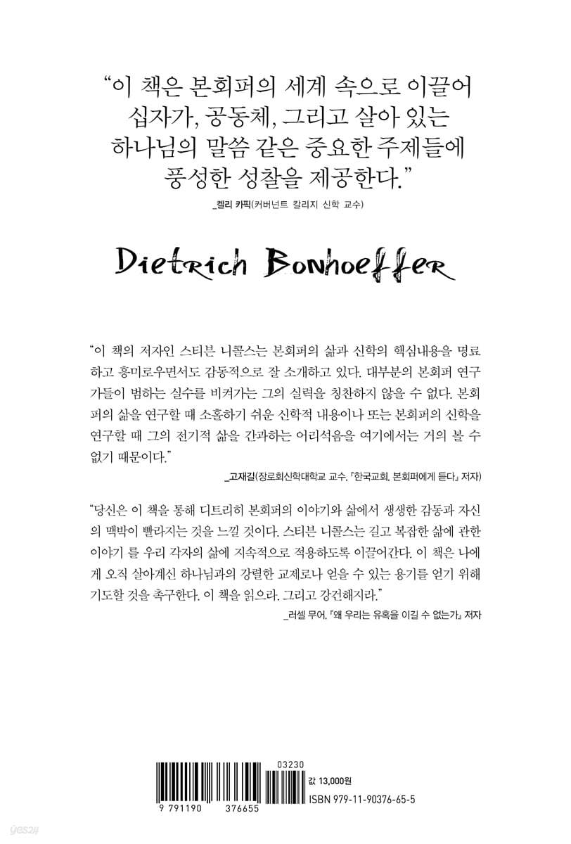 “이 책의 저자인 스티븐 니콜스는 본회퍼의 삶과 신학의 핵심내용을 명료하고 흥미로우면서도 감동적으로 잘 소개하고 있다. 대부분의 본회퍼 연구가들이 범하는 실수를 비켜가는 그의 실력을 칭찬하지 않을 수 없다. 본회퍼의 삶을 연구할 때 소홀하기 쉬운 신학적 내용이나 또는 본회퍼의 신학을 연구할 때 그의 전기적 삶을 간과하는 어리석음을 여기에서는 거의 볼 수 없기 때문이다. 니콜스는 이 책을 통해서 본회퍼를 단순한 정치적 투쟁가나 세속화신학의 선구자로 간주하는 경향과 본회퍼를 복음주의의 틀 안에서만 해석하려고 하는 극단적인 경향을 모두 극복했다. 바른 균형감각으로 본회퍼의 삶과 신학을 정직하게 해석하고 오늘의 구체적인 교회 현실과 사회 상황 속에서 필요한 적용점을 이끌어내고 있는 것이다. 그리스도와 교회를 사랑했던 본회퍼, 기도와 성경읽기, 묵상을 강조했던 본회퍼를 알고 싶은 사람들이나, 세상을 위해 십자가로부터 형성되는 그리스도인의 삶을 실제로 살아내길 원하는 사람들에게는 이 책이 단순한 선택의 문제가 아니라 필수 과제로 다가올 것이다.” - 고재길 (장로회신학대학교 교수, 『한국 교회, 본회퍼에게 듣다』 저자 )
