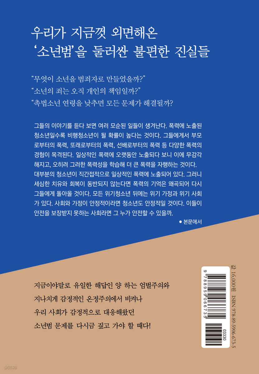 ---「들어가며, 5쪽」중에서 대부분의 청소년이 직간접적으로 일상적 폭력에 노출되어 있다. 그러니 세심한 치유와 회복이 동반되지 않는다면 폭력의 기억은 왜곡되어 다시 그들에게 돌아올 것이다. 모든 위기청소년 뒤에는 위기 가정과 위기 사회가 있다. 사회와 가정이 안정적이라면 청소년도 안정적일 것이다. 이들이 안전을 보장받지 못하는 사회라면 그 누가 안전할 수 있을까. ---「프롤로그, 12쪽」중에서 범죄는 범죄자 개인의 문제임과 동시에 사회적 현상이다. 그가 어떤 환경에서 성장해서 어떻게 살아가고 있는지는 범죄에 막대한 영향을 미친다. 그리고 범죄의 사회적 성격은 청소년에게서 더욱 도드라진다. 우리 사회에서 건전한 시민으로 살아가는 데 필요한 덕목을 배워가는 시기가 청소년기다. 청소년은 경험에 의지해 행동하기보다 자신을 둘러싼 환경에 영향을 받아 행동하는 경향이 크다. 그렇기에 청소년의 행동 이면에는 그의 가정이, 학교가 그리고 우리 사회가 있다. ---「1장 그 소년을 거리로 내몬 것은 누구일까, 27쪽」중에서 그런데도 청소년을 자신들의 돈벌이에 이용하려는 성인들은 마치 개인회생이 모든 빚을 없애주는 희년禧年이라도 되는 것처럼 유혹한다. “괜찮아. 나중에 개인회생으로 한 번에 정리하면 돼”라는 무책임한 말에 많은 청소년이 신용불량자로 전락하고 있다. ---「3장 가난에 몸도 마음도 멍들다, 55쪽」중에서 우리 사회는 청소년 성 착취를 조장하면서 동시에 그들을 처벌하는 모순을 가지고 있다. 이러한 채팅 앱들은 제도적으로 충분히 막을 수 있다. 미성년자의 접근을 차단하거나 대화 내용을 필터링하는 것만으로도 응징적 효과를 얻을 수 있다. 그러나 우리는 그러한 제재조차 하지 않으면서, 가해자가 아닌 피해자가 ‘자발적으로’ 성매매에 가담함으로써 성범죄가 발생할 빌미를 제공했다는 식으로 피해자에게 2차 가해를 가한다. ---「4장 누구를 위한 법인가, 64쪽」중에서 현장에서 청소년들을 만나고 있는 전문가들은 하나같이 가정폭력이 청소년 비행에 상당한 영향을 미친다고 입을 모은다. 영문도 모른 채 아버지한테 흠씬 두드려 맞은 아이에게 아무 일도 없었다는 듯이 학교에 가서 열심히 공부하고 친구들과 사이좋게 지내라는 것이 가능할까. 눈만 뜨면 손찌검을 하는 부모를 피해 집을 나온, 가출이 아닌 탈출을 한 청소년에게 길거리에서 생활하더라도 법질서는 꼭 지키라고 말할 수 있을까. 평생 아버지에게 맞고 자란 아들이 아버지보다 힘이 세졌을 때, 아버지가 폭력을 휘두르더라도 부모니 맞서지 말라고 할 수 있을까. ---「6장 폭력이 또 다른 폭력을 낳다, 97쪽」중에서 누범 청소년들의 특징 중 하나는 비교적 어린 나이에 범죄를 저지르기 시작했다는 점이다. 특히 처음 범죄를 시작한 나이가 어릴수록 누범으로 이어질 가능성이 크다는 것이 전문가들의 대체적인 견해다. 다시 말해 평생 범죄의 굴레에서 벗어나지 못하는 만성적 범죄자가 될 가능성이 높다는 뜻이다. ---「9장 이처럼 화려한 범죄 기록을 본 적이 없다, 133쪽」중에서 우리 사회는 청소년을 모범생과 비행청소년으로 양분하는 집단 무의식에 빠진 것 같다. 하지만 모범생과 비행청소년은 청소년 중 극히 일부분일 뿐이다. 게다가 모든 청소년이 모범생이어야 하는 것은 아니다. 마찬가지로 모범생이 아닌 청소년이 모두 비행청소년인 것도 아니다. ---「10장 범죄 사실조차 인지하지 못하다, 143~144쪽」중에서 반성하지 않고 계속 범죄를 저지르는 청소년에게 소년법은 지나친 관용일 뿐이라고 비난할 수도 있다. 하지만 처벌만이 능사는 아니다. 주변 환경은 그대로인데 강력한 처벌을 내리는 것은 그저 범죄의 수렁에 밀어 넣음으로써 만성적 범죄자를 양산하는 것일 수도 있다. 그보다는 그들에게 한 번 더 기회를 주어 우리 사회의 울타리 안에서 교화를 시도하는 것이 훨씬 나을 것이다. ---「15장 소년범은 왜 성인범이 되었을까, 225쪽」중에서 |