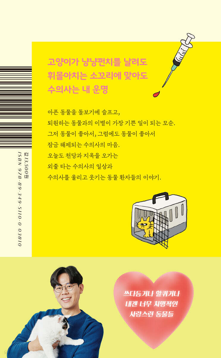 --- p.14 “실습 전까지 나에게 ‘돼지’라는 동물은 길거리에서 쉽게 볼 수 있는 돼지고깃집 간판의 웃는 얼굴이 익숙했다고 해도 과언이 아니었다. 때문에 돼지를 교배시키고 출산을 돕고 새끼 돼지를 비육(살을 찌게 기르는 일) 해서 출하를 돕는 과정과 그 환경은 매우 생경한 일이었다.” --- p.26 “고양이가 기분이 좋을 때 골골거리는 소리를 낸다는 것을 지식으로 알아도 실제로 처음 듣는 낯선 소리에 호흡 이상으로 오해하여 병원을 찾는 보호자가 적지 않다. 누구에게나 처음은 어렵고 부담스럽다. 하지만 동시에 새로운 기쁨과 설렘을 가득 담은 단어이기도 하다. 오늘도 초보 집사에서 베테랑 집사가 되기 위해 필연적으로 겪어야 할 경험치를 쌓고 있는 모든 집사를 응원한다.” --- p.59 “나처럼 많은 수의사가 반려동물을 기른다. 직업적인 특성상 여러 사연의 동물들을 만나다 보니, 정이 들어서, 보살펴주고 싶어서 등 각종 이유로 반려를 시작하는 경우도 많을 수밖에 없다. 병원에선 엄격한, 근엄한, 진지한 모습의 수의사도 본인이 반려하는 동물들 앞에서는 무장 해제가 되는 모습을 지켜보는 것도 나의 소소한 즐거움이다. 저들이 보기에 나도 똑같겠지 하는 생각을 하면서 말이다.” --- p.87 “실력 있는 수의사라는 것은 짧은 시간에 갖추어지는 조건이 아니며 수의사라는 직업을 선택하여 퇴직할 때까지 평생에 걸쳐 노력하는 수의사에게 주어질 수 있는 수식어이다. 우리가 공부를 하면서 오답노트를 작성하듯이 50 대 50으로 보이는 치료의 선택지에서 비슷한 케이스가 누적되었을 때 51 대 49를 구분할 수 있어야만 비로소 그 분야의 대가가 될 수 있기 때문이다.” --- p.155 “마냥 동물을 사랑하는 마음만으로는 좋은 수의사가 될 수 없지만, 그렇다고 동물을 사랑하지 않으면 매일의 일과를 버티기 힘든 그런 직업. 필연적으로 이별이 예정되어 있는 직업. 항상 스스로를 향상하면서, 힘들어하는 보호자를 다독이고 필요하다면 설득을 해서라도 아이들을 포기하지 않도록 돕는 직업. 하지만 생사를 오가던 흐릿한 눈동자가 이내 또렷하게 나를 바라보며 눈인사를 건네는 순간에 그 모든 힘듦이 눈 녹듯 사라지는 직업. 보호자와 함께 울고 웃으며 생명을 지켜내는 직업. 내가 정말 사랑하는 나의 직업이다.” --- p.162 “동물과의 공존은 우리가 그들의 삶을 들여다보고 이해하고 공감하는 순간부터 시작된다. 단순히 인간의 즐거움, 즉 동물들이 우리에게 주는 결과물에만 집중할 경우 동물은 하나의 도구 개념에서 멈추지만, 최소한의 공감이 있다면 하나하나의 생명체가 가지고 있고 누려야 하는 권리가 눈에 보이게 된다. 작은 관심이 있다면 시작될 수 있는 큰 변화를 많은 사람이 알게 되면 좋겠다.” --- p.167 |