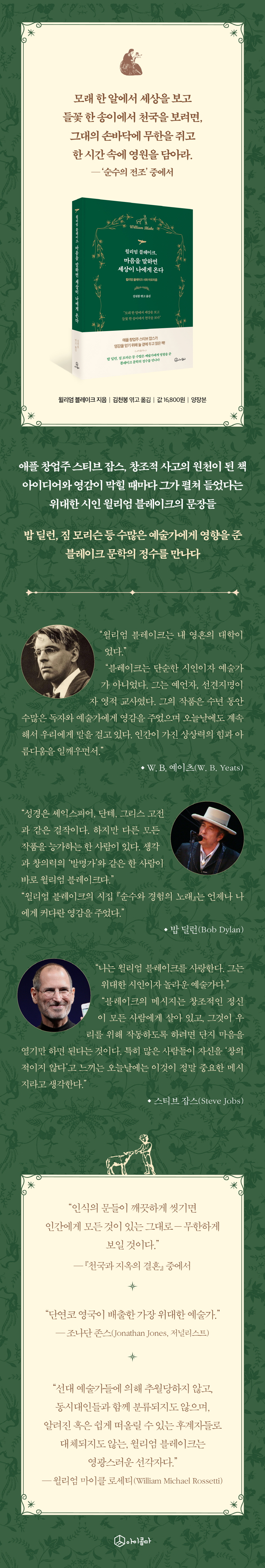 초기 시까지… 윌리엄 블레이크 문학의 정수를 담다 윌리엄 블레이크는 W. B. 예이츠, 단테 가브리엘 로세티, 앨런 긴즈버그 등 수많은 작가들에게 깊은 영감을 준 작가이며, 낭만주의 사조를 이끈 세계에서 가장 큰 영향력을 지닌 시인 중 한 명이다. 밥 딜런, 짐 모리슨을 비롯한 수많은 예술가를 비롯해 신화적 주제를 다룬 영화와 대중문화에 이르기까지 그가 남긴 유산은 지금도 곳곳에서 살아 숨 쉬고 있다. 블레이크는 천국과 지옥으로 상징되는 모순되고 희망이 없어 보이는 세상일지라도, 어느 한 쪽의 희생을 강요하기보다는 진정한 합일을 이룰 때 그동안의 모순은 사라지고 궁극의 지혜를 깨달을 수 있다고 말한다. 천국이 곧 지옥일 수도 지옥이 곧 천국일 수도 있다는 그의 선지자적 경구들을 접하다 보면, 현실에 억눌리고 찌든 때를 벗기는 것과 같은 느낌을 받는다. 록그룹 ‘도어스’의 멤버인 짐 모리슨이 영감을 받았다는 ‘인식의 문들이 깨끗하게 씻기면 인간에게 모든 것이 있는 그대로―무한하게 보일 것이다.’라는 문구에서도 느낄 수 있듯, 무한에 이르는 길은 현실의 모순을 받아들이고 합일된 세상으로 나아가는 과정에 있다고 하겠다. 애플 창업주 스티브 잡스가 생각이 막히거나 아이디어가 필요할 때마다 늘 곁에 두고 탐독한 것으로 유명한 블레이크의 이 책은 인문학적 영감이나 아이디어가 필요한 사람들에게도 훌륭한 보고가 되어준다. 윌리엄 블레이크는 낭만주의 사조를 이끌었음은 물론 밥 딜런, 짐 모리슨, 앨런 긴즈버그 등 현대 대중예술가들에 의해 끊임없이 재해석 되며 여전히 지대한 영향력을 발휘하고 있다. 블레이크의 유명한 시 ‘순수의 전조’에 나오는 유명한 첫 문장을 보자. ‘모래 한 알에서 세상을 보고 / 들꽃 한 송이에서 천국을 보려면, / 그대의 손바닥에 무한을 쥐고 / 한 시간 속에 영원을 담아라.’ 지금도 인류에게 수많은 영감의 원천이 되고 있는 이 시에 담긴 놀라운 예지력은 시대를 초월해 우리에게 의미심장한 통찰과 메시지를 던지고 있다. 독자들은 블레이크의 핵심 작품들이 담긴 한 권의 책, 『윌리엄 블레이크, 마음을 말하면 세상이 나에게 온다』를 통해 낭만주의 예술의 뿌리를 느껴볼 수 있음은 물론, 현대를 사는 우리에게도 인식의 어두운 때를 벗기고 ‘나’라는 본연으로 모습으로 돌아갈 수 있게 하는 좋은 안내서가 되어줄 것이다. 블레이크 특유의 예언자적이고 선지적인 경구들이 영혼의 감흥을 불러일으키는 『윌리엄 블레이크, 마음을 말하면 세상이 나에게 온다』에는 총 64편의 시가 7개의 주제로 나뉘어 수록되어 있다. 이 7개의 주제들은 각각 블레이크의 초기 시집, 『순수의 노래』, 『경험의 노래』, 『천국과 지옥의 결혼』을 세분화한 것이다. 독자들은 이 한 권의 책을 통해 블레이크의 대표작을 비롯한 그의 시들을 간편하게 감상할 수 있다. 짧은 문장 하나하나에 스민 영혼을 울리는 메시지들은 현대를 사는 우리에게도 적잖은 교훈을 준다. 블레이크가 살았던 시대가 프랑스혁명, 산업혁명 등을 거친 격변의 시대였기 때문이다. 또 다른 의미에서 격변기를 보내며 점점 전반을 아우르는 통찰력과 깊은 감성이 요구되는 요즘의 상황과도 맞아떨어진다 하겠다. 영국 대표 시인이 남긴 문화적 유산을 다시금 잘 곱씹어봐야 하는 이유다. 그림과 시가 하나였던, 영혼을 일깨우는 최고의 예술가 윌리엄 블레이크는 미국혁명, 프랑스혁명, 산업혁명 같은 혁명의 시대를 살았던 시인으로서, 그의 작품들을 보면 예언자, 선지자의 목소리가 크게 도드라진다. 그는 당대의 역사, 사회, 문화예술, 정치 등의 제반 문제들에 자신의 예언적 전망들을 덧씌우고 그것을 ‘창조-타락-구원’으로 이어지는 기독교적 역사에 합치시킴으로써 자신만의 독특한 상징체계로 재창조했다. 또한 매우 급진적인 사상가로서, 그의 시 세계는 빈번하게 헤겔의 정반합 변증법에 적용되고 또 설명된다. 가령, 그의 대표적인 두 시집 『순수의 노래』와 『경험의 노래』에는 제목이 똑같거나 유사한 내용의 작품들이 마치 거울을 마주 보고 있는 듯이 서로 대립하고 있다. 블레이크 자신의 표현대로 서로 “변증법적 대립 또는 상반”(dialectical contraries)을 이룬다. ‘순수’와 ‘경험’, 이 두 세계는 루소식의 순수한 자연과 타락한 문명세계, 기독교 신화를 적용하면, 인간의 타락 이전 세계와 그 후 세계의 대립이자 차이를 나타낸다. 이처럼 블레이크는 당대와 후대의 시인들에게 상상력의 표현으로서의 시, 급진적인 사상과 세계관, 시인-예언자로서의 전망 같은 위대한 유산을 전파한 낭만주의 문학의 선구자였다고 할 수 있다. 이 위대한 예술가에게는 그림과 시가 하나였다. 그림을 그리거나 시를 짓는 데 있어서 윌리엄 블레이크가 시종일관 강조한 것은 이성의 억압적인 성격에 맞서는 상상력 혹은 내적 비전의 전복적이고 창조적인 힘이었다. 『윌리엄 블레이크, 마음을 말하면 세상이 나에게 온다』 역시 그의 판화본 원전에서 가져온 그림 몇 점을 초판본의 디자인을 참고하여 실었다. 비록 실제 작품을 보는 감성을 전달하진 못하겠으나 시와 그림