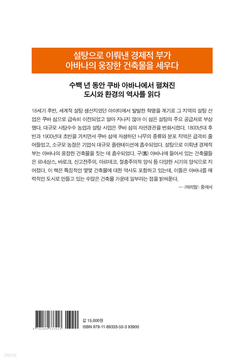 ---「머리말」중에서 스페인이 아메리카에 도착해서 거주지를 만들 때 도시는 영역 확장을 위한 지지 기반의 중심지로서 역할했고, 점차 종교적?군사적 중심지로 발전했다. 도시는 스페인 제국이 지속적인 영토 편입으로 확장된 식민지를 통합하는 데에 중요한 도구로 작용했다. 신세계 정복자들은 ‘도시’를 아메리카의 식민지화에서 중요한 도구로 인식한 것이다. 그들은 정치적·군사적·종교적 권력의 장소, 그리고 무역을 잇는 기반시설이 있는 장소로 도시를 만들어 갔다. ---「2장 구 아바나의 도시계획과 건축」중에서 아바나 도시의 구조는 스페인의 도시계획에 기반을 두고 있으며, 조밀하고 균일한 구획 패턴과 광장과 교회가 특징이다. 아바나가 중세 도시의 모습이 있다고 하더라도 중세 도시에서 보이는 비정형 설계보다는 좀 더 정형화한 도시 구조를 갖추고 있었다. 도시 요새와 방벽, 밀집한 격자 패턴의 도시 배열, 좁은 도로는 아바나에서 중세 도시의 일면을 볼 수 있는 특징이기도 하다. 중세 후기 유럽에서 상업과 교역의 발달은 스페인의 식민지에도 영향을 주었다. 식민 도시로서 아바나는 이러한 중세 후기 교역 도시의 특성이 있었으며, 중세 도시 구조의 중심인 성당과 광장을 주요 요소로 갖추고 있었다. (……) 아바나는 이러한 특성과 더불어 르네상스 시대의 도시 특징도 보인다. 중세에 이은 르네상스 시대는 식민지 개척의 시대이기도 했다. 이 시기에는 교역을 위한 도시망이 확장해 나갔고 당시 발명된 대포와 화약으로부터 방어하기 위한 체계를 구축해 갔다. 이러한 르네상스 시대 도시 특징은 아바나의 요새에도 반영되었다. ---「2장 구 아바나의 도시계획과 건축」중에서 18세기 중후반 쿠바에서는 노예 플랜테이션에 기반하여 설탕과 커피 산업이 급속히 성장했다. 여기서 축적된 부는 아바나의 건축물에 반영된다. 부유한 계층은 큰 부지에 그들의 주택을 새로운 건축 양식으로 짓기 시작한다. 당시 새로운 건축 양식이란 18세기 말 프랑스를 중심으로 시작되어 유럽 전역에 퍼져 나간 신고전주의 양식이었다. 신고전주의 양식은 바로 앞선 로코코 양식이나 후기 바로크 양식의 번잡스러움에 대한 반발로 엄격하고 균형 잡힌 고대 양식에서 모티프를 얻었다. 유럽에서 시작된 신고전주의 양식은 수십 년이 지난 1840년대에 이르러서야 아바나에 본격적으로 도입되었다. 그러나 그보다 이른 1828년에 신고전주의 양식인 엘 뗌쁠레떼가 지어졌고, 이는 아바나 대성당으로 대표되는 쿠바 바로크 건축 양식에서 신고전주의 양식으로의 전환을 보여 준다. ---「3장 역사적 장소들」중에서 스페인-미국 전쟁(Spanish-American War, 1898)에서 승리한 미국의 투자자들은 쿠바 개발에 본격적으로 돈을 쏟아부었다. 신고전주의식 건축물, 이탈리아 르네상스식 건축물에서 아르데코와 현대식 건축물까지 지어졌다. 아르데코 양식은 1927년 미라마르(Miramar) 거주 구역에서 유행하기 시작했다. 나시오날 데 쿠바 호텔(Hotel Nacional de Cuba, 1930)에 이은 에디피시오 바까르디(Edificio Bacardi, 1930)는 아바나 시에서 아르데코 건축 양식의 대표적인 사례이다. 이 건축 양식은 미라마르뿐 아니라 마리아나오(Marianao), 그리고 베다도의 부유한 지역에서도 유행했다. ---「3장 역사적 장소들」중에서 그러나 1959년 1월 1일 쿠바혁명으로 들어선 새로운 정부의 관심사는 발전이 뒤처진 지방의 균형 발전이었기 때문에 수도였던 아바나를 거의 방치했고, 이러한 무관심 덕분에 아바나의 옛 도시 구조와 기념비적인 건축물이 보존될 수 있었다. 도시와 농촌의 불균형을 바로잡기 위한 혁명 정부의 정책은 지금의 구 아바나 지역을 비롯한 아바나 도처에 오래된 건물과 거리 구조를 도시의 화석처럼 그대로 남겼다. 또한, 혁명 이후 아바나에 주택이 부족하자 정부는 대규모 주택 단지를 공급하는데, 이는 소비에트 스타일의 현대 건축물이었다. 대량으로 공급된 이 건물들 덕분에 역사적 건축물의 보존이 가능했다는 평가도 있다. ---「3장 역사적 장소들」중에서 미국에 기반을 둔 쿠바 설탕 산업 투자자들은 매우 유리한 경제적·정치적 환경에서 쿠바에서 이윤을 얻었다. 설탕 산업은 당시에 인기 있는 투자처였고 신규 설탕 회사가 불과 몇 주 만에 조직되기도 했다. 그리고 수개월 내에 광대한 토지에 사탕수수를 심었고, 거대한 설탕 공장을 건설했다. (……) 20세기 초 미국의 이해관계에 의한 쿠바의 설탕 산업 성장은 쿠바 섬의 자연에 영향을 끼치는 외부 세계의 힘을 보여준다. 당시 외국인 투자자에게 쿠바 섬의 사탕수수 농장의 확장과 설탕 산업의 확대는 시장에서 단기적 수익을 올리는 방법이었으므로 쿠바의 삼림 지역은 사탕수수 재배지로 빠르게 대체되었다. ---「4장 설탕과 아바나」중에서 설탕 산업이 가져온 것은 경제적 성장이기도 했지만, 삼림의 벌목과 광범위한 경지화, 생태적 다양성의 파괴로 이어졌다. 특히 다양한 수종이 있던 동부 지역의 울창한 삼림과 팜나무와 관목이 있던 사바나 지역이 대단위 플랜테이션 지역과 설탕 공장으로 대체되었다. ---「4장 설탕과 아바나」중에서 아바나를 이해하는 데에
