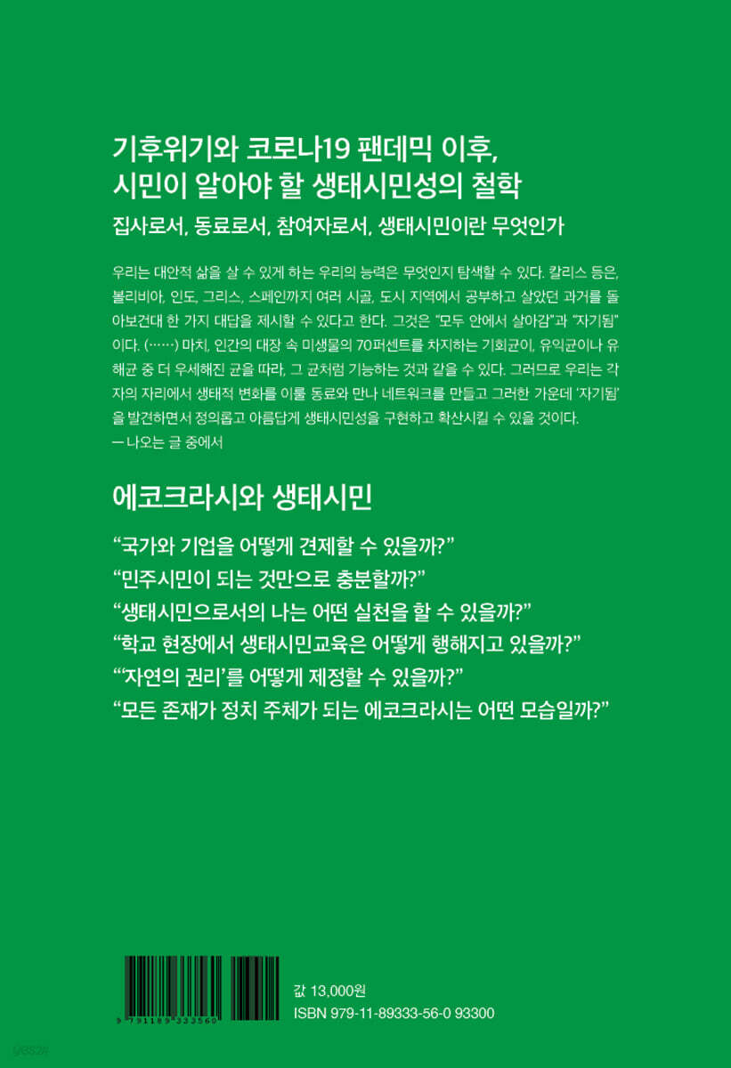 시민이 알아야 할 에코크라시의 철학 집사로서, 동료로서, 참여자로서, 생태시민이란 무엇인가 알렙 그린풋 시리즈 두 번째 이야기 생태위기 시대를 살아가는 시민들에게 필요한 덕성은 어떤 것인가? 정치학자로서 생태주의를 포함한 다양한 대안 담론을 연구해 온 이나미는 방대한 문헌 연구와 치밀한 사색 끝에 가장 최신의 ‘생태시민성’ 논의를 종합해 냈다. 그것이 바로 이 책, 『생태시민으로 살아가기: 에코크라시를 향하여』이다. 지금까지 한국 사회 공론장에 ‘시민성’, ‘민주 시민’, ‘민주주의’를 주제로 한 담론은 적지 않았으나, ‘생태시민성’, ‘생태시민’, ‘생태 민주주의’는 여전히 낯선 개념들이다. 저자는 이러한 개념들을 알기 쉽게 소개하며, 우리 각자가 ‘생태시민’이 되는 것이 생태위기와 정치적·사회적 위기를 극복할 수 있는 길(데모크라시에서 에코크라시로)이라고 이야기한다. 생태위기는 기후위기와 코로나19 팬데믹을 불러오고, 이는 정치적·사회적 위기로까지 이어지고 있다. 작금의 중동 난민 사태, 국제 분쟁의 증가도 기후변화와 무관하지 않다. 그러나 각국 정부, 국제사회, 미디어는 이 같은 생태 문제에 무감각하다. 그 배경에는 경제계의 이권과 로비가 있다. 그러나 문제는, 불을 때는 사람과 불에 타 죽는 사람이 다르다는 점이다. 기후위기로 인해 희생당하는 것은 결국 기후위기에 아무 책임이 없는 지역의 사람들과 우리의 후손이다. 즉, 기후변화는 ‘정의의 문제’, ‘기후정의’ 문제를 일으킨다. 기후변화는 비단 자연재해만 불러오는 것이 아니다. 그에 따른 사회적 변화와 위험이 야기된다. 저자는 『위험사회』을 쓴 울리히 벡을 따라, 개인주의화의 증대, 불평등의 심화, 민주주의의 훼손과 과학적·관료적 권위주의의 심화, 사회적 증오의 발생에 대한 우려를 밝힌다. 특히, 기후위기 등의 생태 문제 해결을 위해 생태권위주의가 필요하다는 주장에 대한 경계를 표하는데, 저자는 독재와 권위주의가 위기에 더욱 취약하며, 생태위기로 인한 민주주의의 위기와 인권 침해는 또 다른 재앙의 원인이 된다는 점을 지적한다. 따라서 기후위기는 민주주의의 문제이자, 인권의 문제이기도 하다. 그럼에도 기후변화와 사회적 위기에 무관심한 국가와 기업의 태도를 볼 때, 우리는 이를 바라보고 있을 수만은 없다. 국가는 관료제의 경직성과 기업의 로비 등으로 진정한 친환경 정책을 실행하기 어렵다. 또, 기업은 단기적인 이익에 급급해 장기적이고 윤리적인 정책을 지지할 리 만무하다. 따라서 희망은 시민사회와 시민에게 있다. 시민은 상호 협력과 연대를 통해 국가와 기업을 견제하고 생태위기를 막기 위해 노력해야 한다. 이것이 생태시민성이 요구되는 이유이다. 그렇다면 생태시민으로 살아간다는 것, 생태시민성이란 무엇인가? 저자는 생태시민성에 관한 다양한 이론을 모색하는 데에서부터 출발하여, 자연에 대한 집사, 동료, 참여자로서의 태도라는 대답을 내놓는다. 집사로서의 생태시민성은 ‘스튜어드십’에 기초한다. 스튜어드십 모델은 인간이 자연을 지배하는 것이 아니라 책임을 지는 것이다. 즉, 자원 사용의 지속가능성, 다양한 생태계들 간의 통합, 자연의 생존에 대한 책임을 진다. 그리고 이러한 책임에는 양육과 돌봄, 사랑, 공경이 따른다. 동료로서의 생태시민성은 다른 존재를 믿고 의지하고 협력하는 ‘파트너십’에 기초한다. 자연은 인간의 아래나 위가 아닌 ‘옆’에 존재하며, 독립적이고 고유한 가치를 가진다. 상호작용과 상호발전의 역동적 과정에서 함께 존재하고 함께 일하는 파트너십 모델에서 핵심 요소는 ‘등가성’과 ‘목적성’으로, 이 둘은 인간과 더불어 자연의 목적을 실현하기 위한 것이다. 마지막으로 참여자로서의 생태시민은 인간이란 존재가 자연의 일부로 자연에 소속되는 것으로, 인간을 포함해 자연에 참여하는 각 생물들이 가진 고유한 가치, 각 존재의 고유성과 차이가 핵심적인 중요성을 가진다. 이때 참여자 모델에는 영성적 내용도 포함되는데, 그것은 자신의 실존과 대면하고 ‘자신됨’을 회복하는 것, 다시 말해 우주와 연결된 자신을 발견하는 ‘생태적 영성’을 의미한다. 그러나 한편으로 저자는 이러한 생태시민성의 조건을 지나치게 가혹한 조건으로 내세워서는 안 된다고 말한다. 그렇게 할 경우 도리어 사람들이 생태적 실천을 포기하게 만들 수 있기 때문이다. 채식을 예로 든다면, 한 사람의 완전한 채식인보다 열 사람의 불완전한 채식인이 생태의 회복에 기여하는 바가 더 크다. 따라서 중요한 것은 ‘완벽한’ 생태시민성을 추구하는 것이 아닌, 실천과 대화의 네트워크이다. 그러한 네트워크 속에서 비로소 작은 변화라도 시도하자는 상호 간 격려, 그러한 변화를 지속하기 위한 조직적 지원, 그것을 비난하고 음해하는 세력의 약화가 가능해진다. 그리하여 우리는 각자의 자리에서 생태적 변화를 이룰 동료를 만나 네트워크를 만들며 생태시민성을 구현·확산시킬 수 있을 것이다. 국가와 기업을 어떻게 견제할 수 있을까? 국가와 기업은 생태 문제에 정직하게 대면할 수 없다. 국가는 경