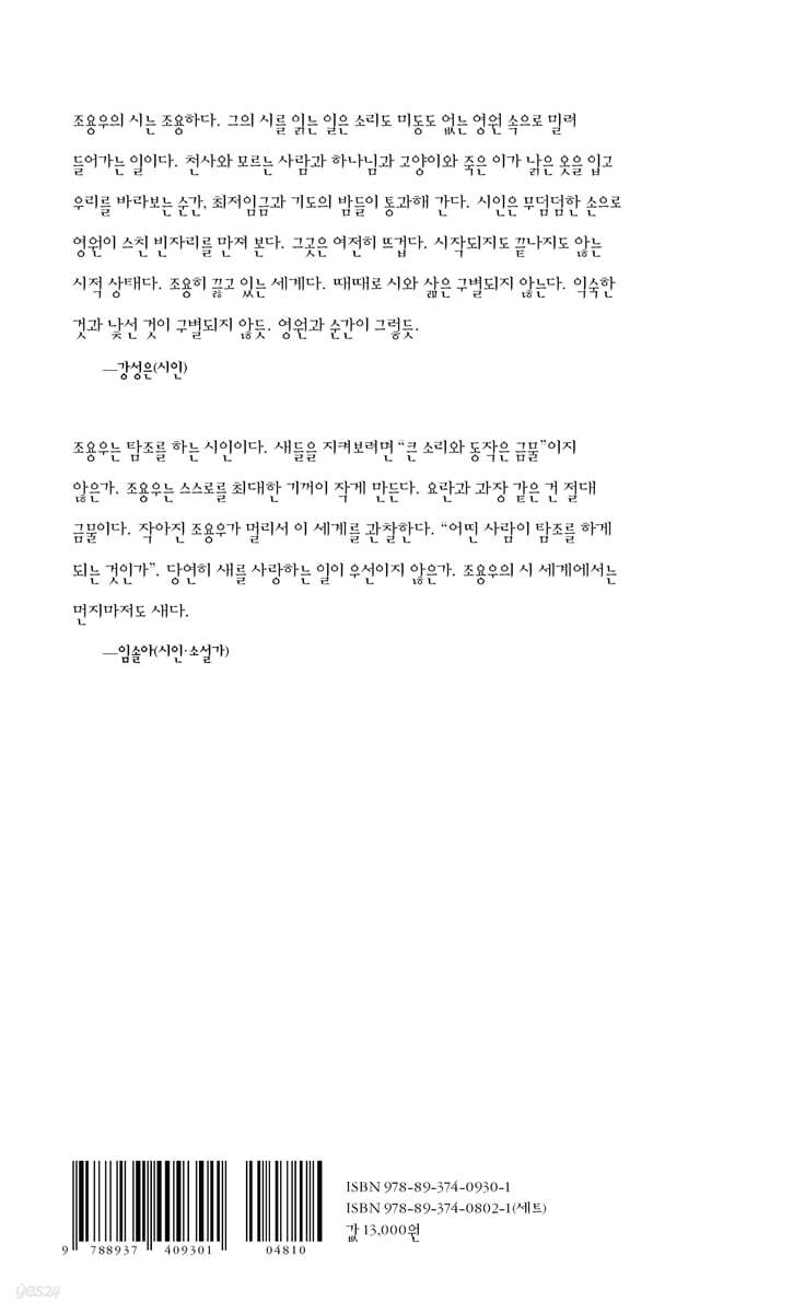 조용우는 탐조를 하는 시인이다. 새들을 지켜보려면 “큰 소리와 동작은 금물”이지 않은가. 조용우는 스스로를 최대한 기꺼이 작게 만든다. 요란과 과장 같은 건 절대 금물이다. 작아진 조용우가 멀리서 이 세계를 관찰한다. “어떤 사람이 탐조를 하게 되는 것인가.” 당연히 새를 사랑하는 일이 우선이지 않은가. 조용우의 시 세계에서는 먼지마저도 새다. - 임솔아 (소설가,시인)