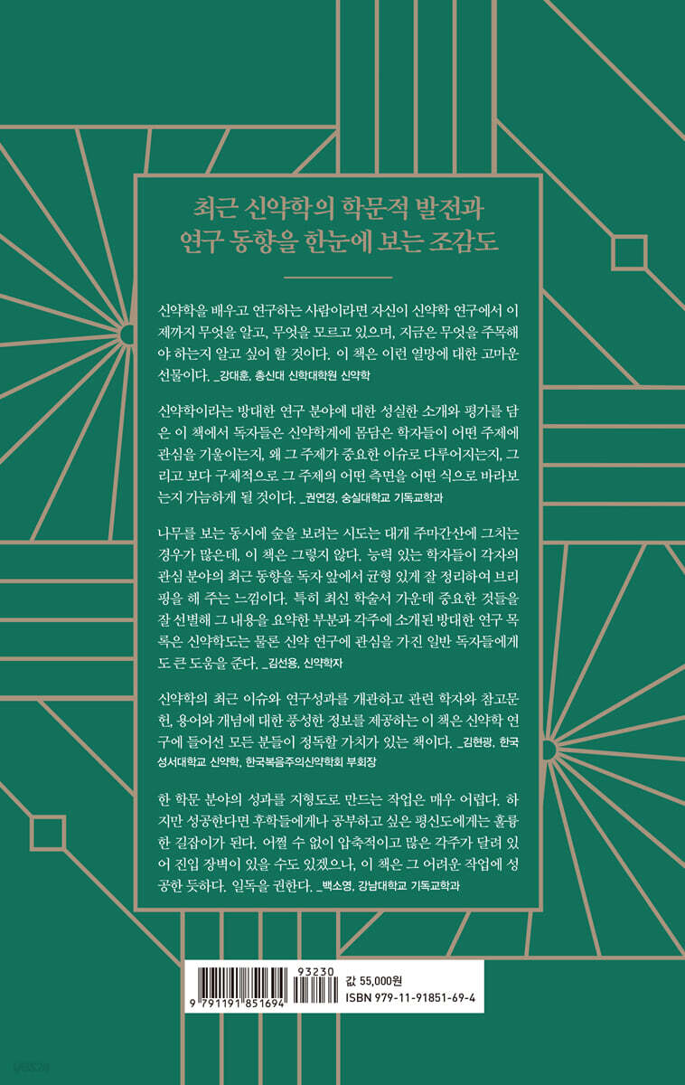 나무를 보는 동시에 숲을 보려는 시도는 대개 주마간산에 그치는 경우가 많은데, 이 책은 그렇지 않다. 능력 있는 학자들이 각자의 관심 분야의 최근 동향을 독자 앞에서 균형 있게 잘 정리하여 브리핑을 해 주는 느낌이다. 특히 최신 학술서 가운데 중요한 것들을 잘 선별해 그 내용을 요약한 부분과 각주에 소개된 방대한 연구 목록은 신약학도는 물론 신약 연구에 관심을 가진 일반 독자들에게도 큰 도움을 준다. - 김선용 (신약학자)