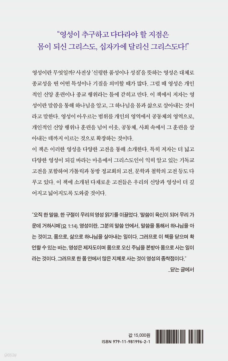 여는 책 몸의 영성을 찾아서_ 아타나시우스의「 말씀의 성육신에 관하여」 읽기 1부 말씀이 육신이 되어 1장 하나님을 찾아서_ 아우구스티누스의 「고백록」 읽기 2장 나를 찾아서_ 파스칼의 「팡세」 읽기 3장 죽음을 넘어서_ 톨스토이의 「이반 일리치의 죽음」 읽기 4장 영적인 삶을 찾아서_ 헨리 나우웬의 「영적 발돋움」 읽기 5장 죄를 넘어서_ 존 번연의 「죄인 괴수에게 넘치는 은혜」 읽기 6장 고난을 넘어서_ 십자가의 성 요한의 「어둔 밤」 읽기 7장 내 안의 길을 찾아서_ 몰리노스의 「영성 깊은 그리스도인」 읽기 8장 내 마음속 사막을 찾아서_ 「사막 교부들의 금언집」 읽기 9장 삶을 찾아서_ 귀고 2세의 “수도사의 사다리” 읽기 10장 기도를 찾아서_ 무명의 수도자의 「기도」 읽기 2부 우리 가운데 거하시매 11장 사람을 찾아서_ 도스토옙스키의 「까라마조프 씨네 형제들」 “대심문관” 읽기 12장 어머니 하나님을 찾아서_ 엔도 슈사쿠의 「침묵」 읽기 13장 그리스도인의 정체성을 찾아서_ “디오그네투스에게 보내는 편지” 읽기 14장 내 안의 원수를 찾아서_ 디트리히 본회퍼의 「성도의 공동생활」 읽기 15장 사회 참여의 영성을 찾아서_ 엘리자베스 오코너의 「세상을 위한 교회, 세이비어 이야기」 읽기 16장 투표의 영성을 찾아서_ 짐 월리스의 「하나님의 정치」 읽기 17장 고향을 찾아서_ 앙드레 지드의 「탕자, 돌아오다」 읽기 18장 합리적 영성을 찾아서_ C. S. 루이스의 「순전한 기독교」 읽기 19장 다원적 영성을 찾아서_ 레슬리 뉴비긴의 「다원주의 사회에서의 복음」 읽기 20장 정체성의 영성을 찾아서_ 하우어워스와 윌리몬의 「하나님의 나그네 된 백성」 읽기 닫는 책 나만의 영성을 찾아서_ 리처드 포스터의 「생수의 강」 읽기 |