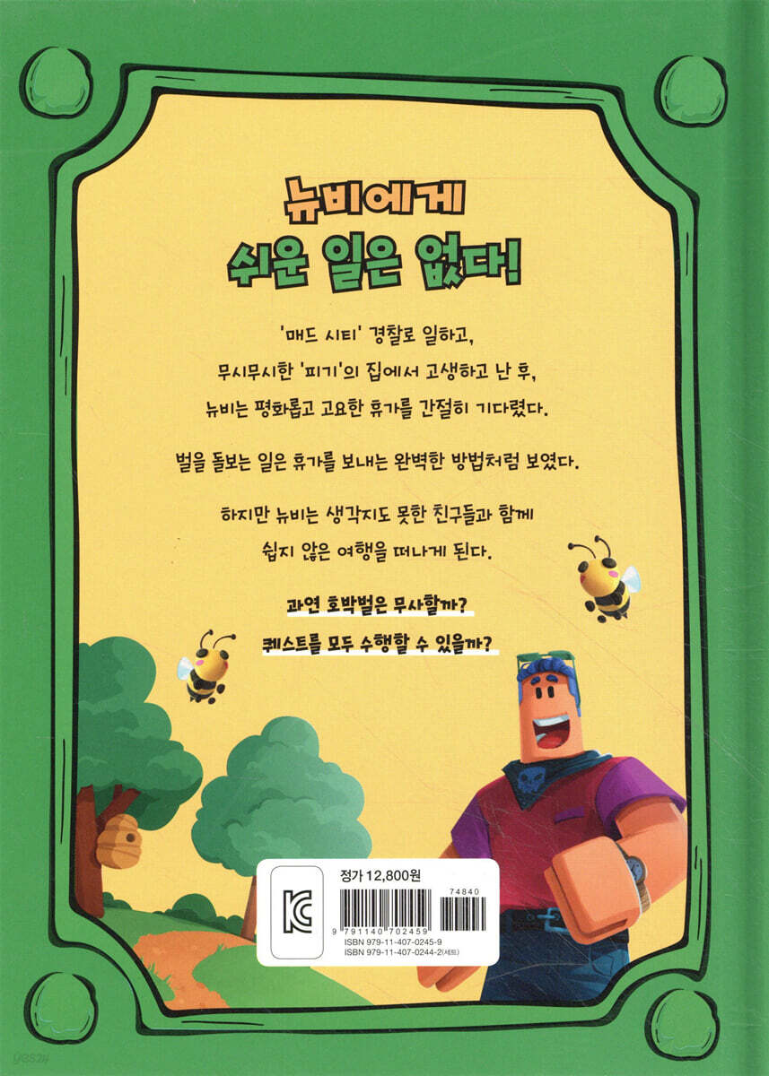 상상력을 키우는 동화로 만나자! 하루 평균 4000만명 이상이 이용하고 있는 게임인 ‘로블록스’는 전 세계 어린이들에게 사랑받고 있다. 로블록스 안에서 자신의 캐릭터를 꾸미고 친구들과 게임을 하는 로블록스는 가상세계를 말하는 메타버스의 대표주자로 꼽힌다. 『뉴비의 로블록스 모험 일기』를 통해 게임으로만 즐기던 로블록스를 상상력이 커지는 이야기로 만나보자. 뉴비의 모험 이야기를 따라 책을 읽다 보면 게임의 흥미를 넘어 읽기의 재미를 느낄 수 있다. 게임을 하는 것처럼 생동감 넘치는 묘사와 비유는 상상력을 자극한다. 이야기를 상상하다 보면 상상력과 창의력도 커지는 계기가 될 것이다. 책 읽기가 어려웠던 어린이에게도 동화책을 읽을 수 있는 시작이 될 수 있으며 읽기 능력의 향상과 성취감을 얻을 수 있다. 게임보다 재미있는 뉴비의 모험 이야기를 읽어 보자! ‘매드 시티’에서 경찰로 일하고, 무시무시한 ‘피기’의 집에서 고생하고 난 후, 뉴비는 평화롭고 고요한 휴가를 간절히 기다렸다. 벌을 돌보는 일은 휴가를 보내는 완벽한 방법처럼 보였다. 하지만 뉴비에게 벌을 돌보는 일은 처음이었고, 벌집을 키우는 것은 더욱 쉽지 않았다. ‘벌떼 시뮬레이터’에서 가장 큰 벌집을 쌓아 올린 마리오를 만나 자신의 벌과 벌집이 초라하게 느껴지기도 했다. 뉴비는 질투심 때문인지 짜증이 났고 네이트와 벌들에게 화를 내고 말았다. 어느 날 네이트가 벌집을 떠난 사실을 알게 되었고, 네이트를 찾기 위해 뉴비는 질투심은 잠시 접어두고 ‘벌떼 시뮬레이터’의 최고 플레이어인 마리오에게 도움을 청하기로 마음먹는다. “함께라면 어떤 문제도 헤쳐 나갈 수 있어!” 뉴비의 모험과 함께 협동심과 사회성을 배워 보자! 뉴비와 마리오, 카즈는 네이트를 찾아 떠난 여행에서 대왕 무당벌레, 사마귀를 만나기도 하고, 판다 곰을 만나 퀘스트를 받기도 한다. 쉽지 않은 여행에서 만나는 몬스터들을 뉴비와 친구들이 힘을 모아 물리친다. 함께라면 어떤 어려움도 잘 해결해 나갈 수 있다는 용기와 협동심의 힘을 느낄 수 있다. 뉴비에게 도움이 되고자 떠난 네이트의 마음과 네이트에게 사과를 하는 뉴비의 이야기를 통해 친구의 소중함과 친구 사이에서 지켜야 할 배려의 마음을 배울 수 있다. |