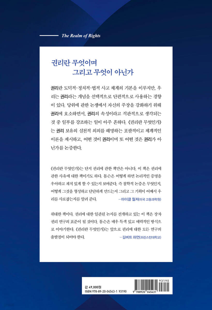 『권리란 무엇인가』는 권리 이론의 구조 위에 구축된 체계적인 규범적 윤리 이론을 제시하고 옹호한다. 권리 이론의 전문가인 톰슨이 이 책에서 논의를 전개하는 솜씨란 정말 ‘장인(匠人)’이라 부를 만하다. 톰슨만큼 능숙하고 상상력 있게 일반화하고 반례를 제시하는 작업을 해낼 수 있는 사람은 아마도 이 세상에 없을 것이다. - 조엘 파인버그 (애리조나대학교)