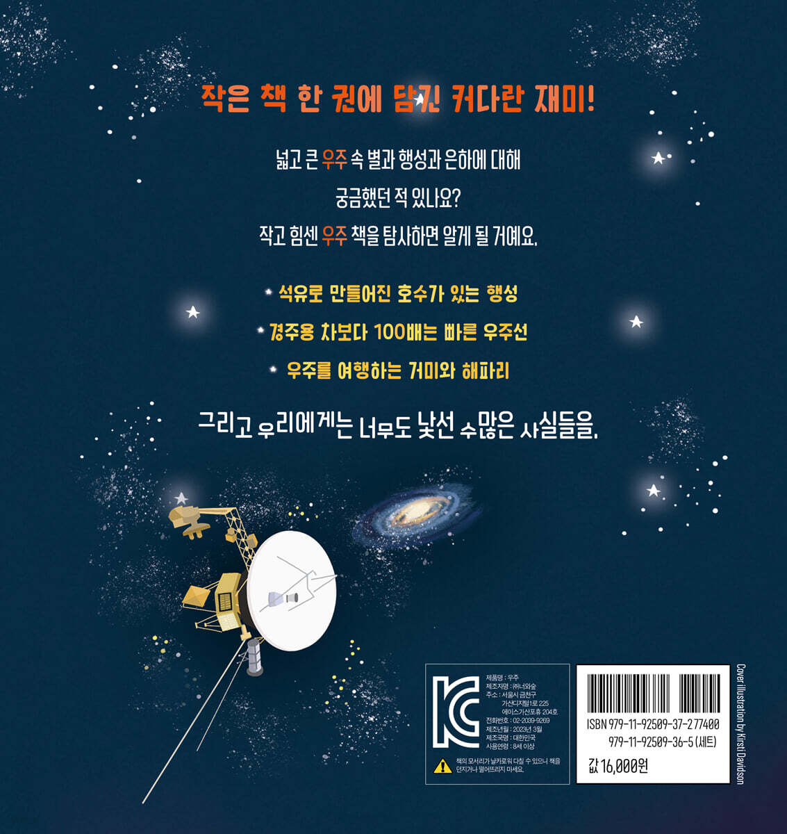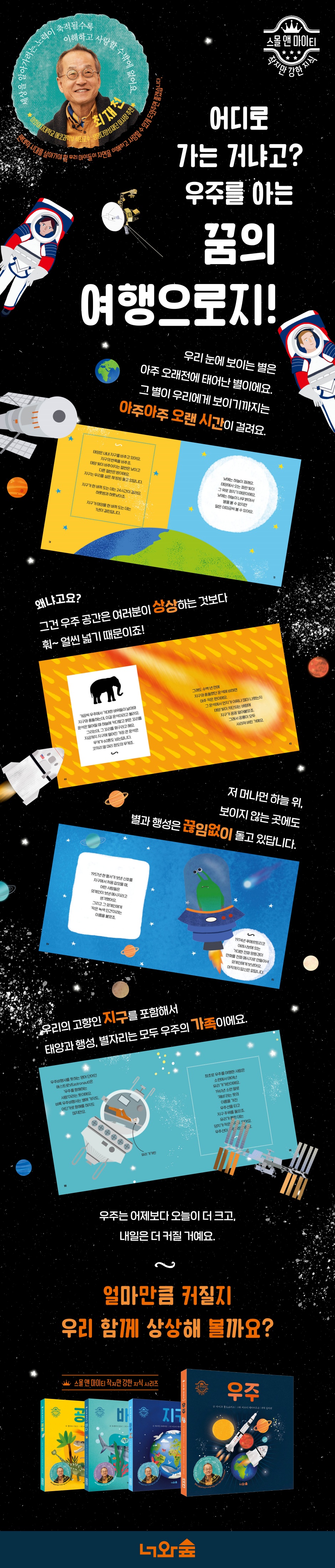 흥미진진한 스토리텔링과 풍부한 일러스트를 통해 저절로 공부가 되고 지식이 쌓이는 과학 그림책 시리즈 [스몰앤마이티]. [스몰앤마이티] 시리즈는 총 4권으로 『공룡』, 『우주』, 『지구』, 『바다』로 구성되어 있어요. 비주얼 디자이너의 생생한 일러스트와 함께, 100권이 넘는 책을 쓴 영국 과학 전문 저널리스트의 친근하고 쉬운 설명이 글 읽는 맛을 더하고, 아이들이 성장하는 과정에서 세상 밖을 향해 넘치는 호기심을 단숨에 해결해줄 거예요. 너와숲출판사의 [스몰앤마이티] 지식 과학 그림책 시리즈를 접한 아이들은 드넓은 세상을 향한 호기심을 가지고 스스로 과학 놀이터 속으로 뛰어들 수 있답니다. 각 권이 한 가지 주제를 충실히, 폭넓게 다루고 있어 스스로 읽고 탐구하는 습관을 터득하고 과학 사고력을 기를 수 있도록 도와줍니다! 넓고 큰 우주, 빛나는 별과 행성은 우리 눈에 보이지 않는 저~ 위에서 빙글빙글 돌고 있답니다. 자, 그럼 이제 책장을 넘기면서 신비한 우주로의 여행을 다 함께 떠나보자구요! |