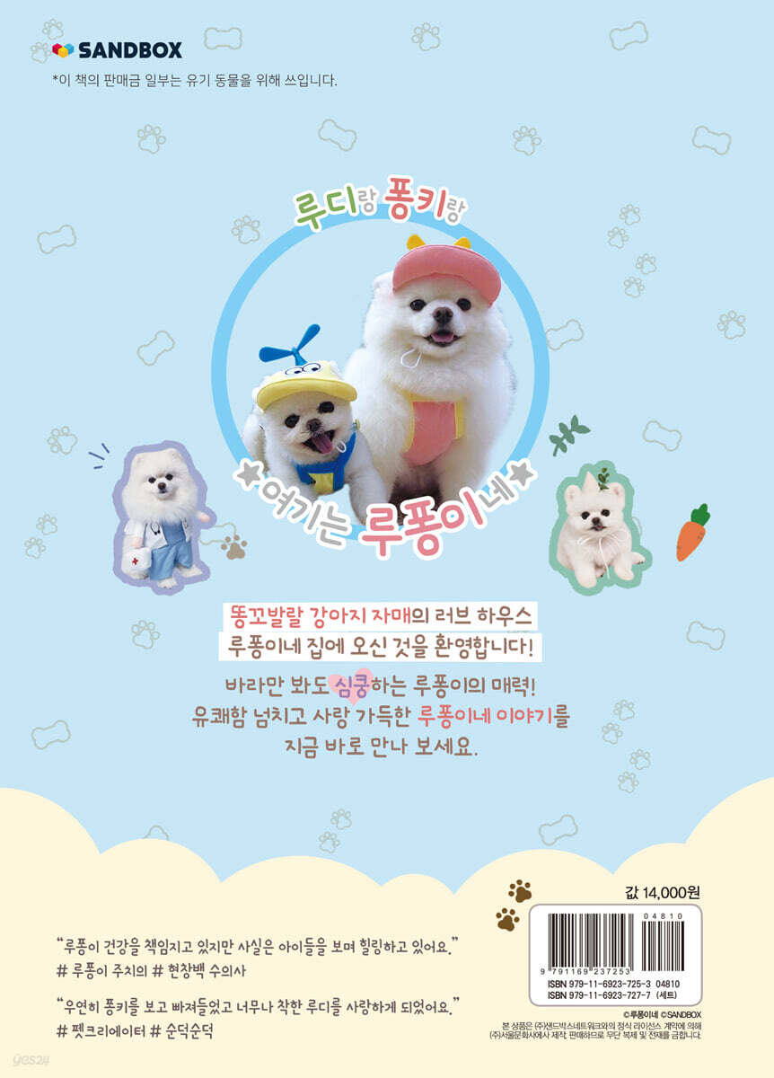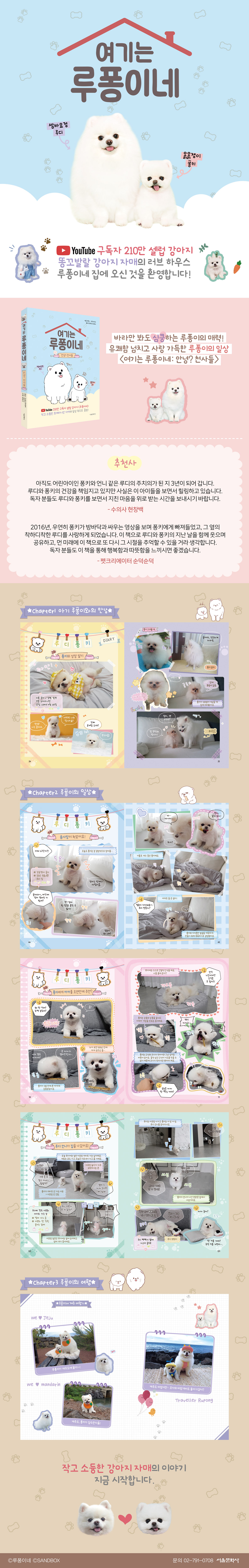 1화 루디의 성장 일기 … 14 2화 퐁키의 성장 일기 … 24 3화 루퐁이의 만남, 그리고 1년 … 34 Chapter 2. 루퐁이의 일상 4화 솜사탕이 녹았어요! … 44 5화 루디의 다친 다리를 마사지해 주는 퐁키 … 50 6화 베란다에 워터파크를 만들어 줬어요! … 56 7화 퐁키가 엄마와 화해할 때 주는 것은? … 62 8화 퐁키에게 까까를 오랜만에 주면? … 70 9화 집에 도둑이 들었어요! … 76 10화 춥다고 덜덜 떠는 강아지 … 84 11화 퐁키, 미용하는 날! … 92 12화 자다가 구급차 소리가 들리면? … 102 13화 잡았다~, 요놈! … 110 14화 엄마가 아파요! … 116 15화 루디 언니가 집을 나갔어요! … 122 16화 목욕이 너무 좋은 퐁키 … 130 17화 퐁키가 옷을 입고 욕조에 들어갔어요! … 134 18화 당당해도 너무 당당한 도둑 강아지 … 140 19화 발 닦아 주면 들어오는 효녀 … 146 20화 산책보다는 간식이지! … 150 Chapter 3. 루퐁이의 여행 루퐁이네 제주 여행기(포토 화보) … 162 쉬어가기 부록 |