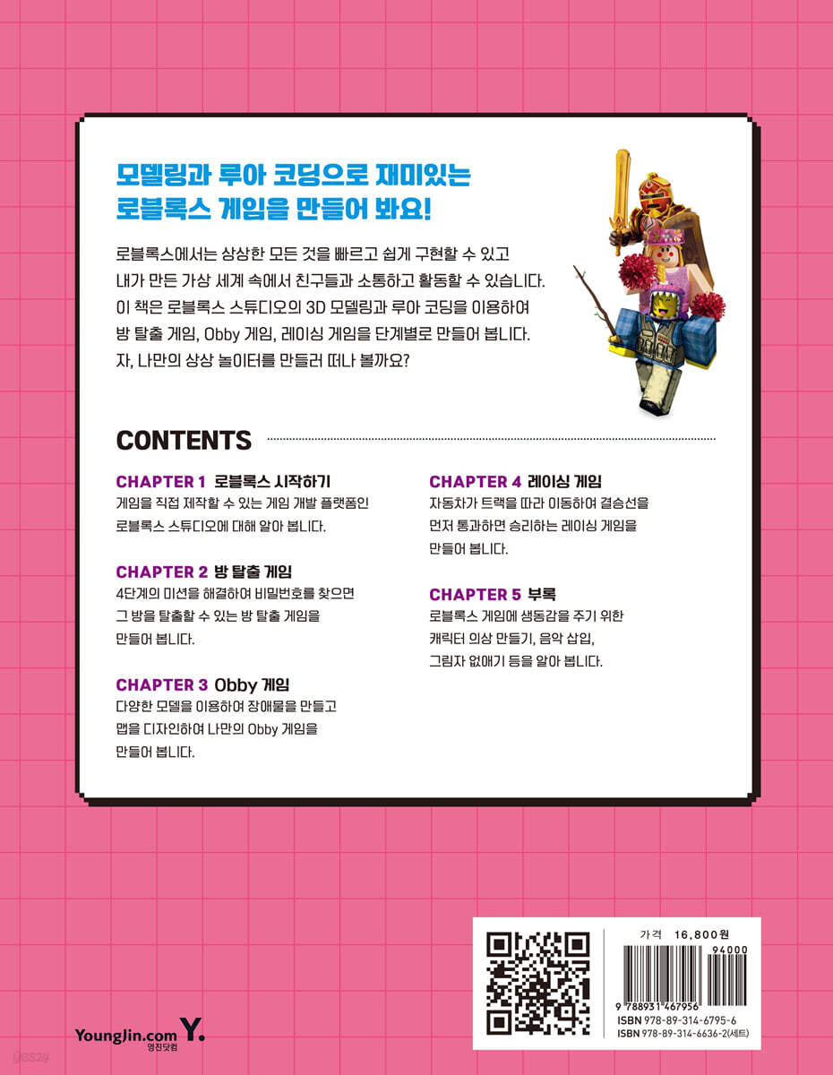 로블록스는 자신만의 게임을 만들어 보고 싶은 사람들을 위한 무료 3D 온라인 플랫폼으로, 이 곳에서 상상력을 한껏 펼칠 수 있습니다. 내가 만든 게임을 전 세계 플레이어와 함께 플레이할 수 있고, 게임을 함께 만들 수도 있습니다. 자, 그럼 다 같이 로블록스의 바다로 빠져 볼까요? 챕터 1에서는 로블록스 스튜디오 설치 방법 및 사용 방법을 간단하게 알아봅니다. CHAPTER 2 방 탈출 게임 첫 번째 게임으로 방 탈출 게임을 만들어 봅니다. 총 4단계로 이루어져 있으며 각 단계에서 제시되는 미션을 해결하여 비밀번호를 찾으면 방을 탈출할 수 있습니다. 방 탈출 게임은 3가지 게임 중 가장 쉬운 난이도의 게임으로, 코딩을 최소화하여 구현할 수 있는 단계로 안내하겠습니다. 다양한 미션들을 잘 생각해 보면서 만들어 봅시다. CHAPTER 3 Obby 게임 두 번째 게임은 로블록스 게임을 해 본 친구들이라면 누구나 해 본 경험이 있는 Obby 게임입니다. 지형 툴을 이용한 기본 맵 만들기부터 시작하여, 파트를 밟으면 천천히 사라지는 obby, 미션을 수행할 때마다 아이템을 획득할 수 있는 아이템 존, 플레이어가 닿으면 스피드가 빨라지는 다리 등 다양한 모델을 이용하여 장애물을 만들어 보며 나만의 Obby 게임을 완성합니다. CHAPTER 4 레이싱 게임 로블록스로 만드는 세 번째 게임은 ‘자동차 레이싱 게임’입니다. 로블록스 스튜디오에서 제공하는 템플릿과 이미 제작되어 있는 스크립트 및 모델들을 사용하면, 보다 다양한 게임을 만들 수 있습니다. 자동차 레이싱에 필요한 자동차를 직접 제작해 보고, 레이싱을 하기 위해 필요한 것들을 구현해 보겠습니다. CHAPTER 5 부록 챕터 5에서는 로블록스 게임에 생동감을 주기 위한 캐릭터 의상 만들기와 음악 삽입 그리고 그림자를 없애는 방법을 알아보려고 합니다. 쉽게 따라 할 수 있으니 내가 만든 게임에 생동감을 한번 불어넣어 볼까요? |
