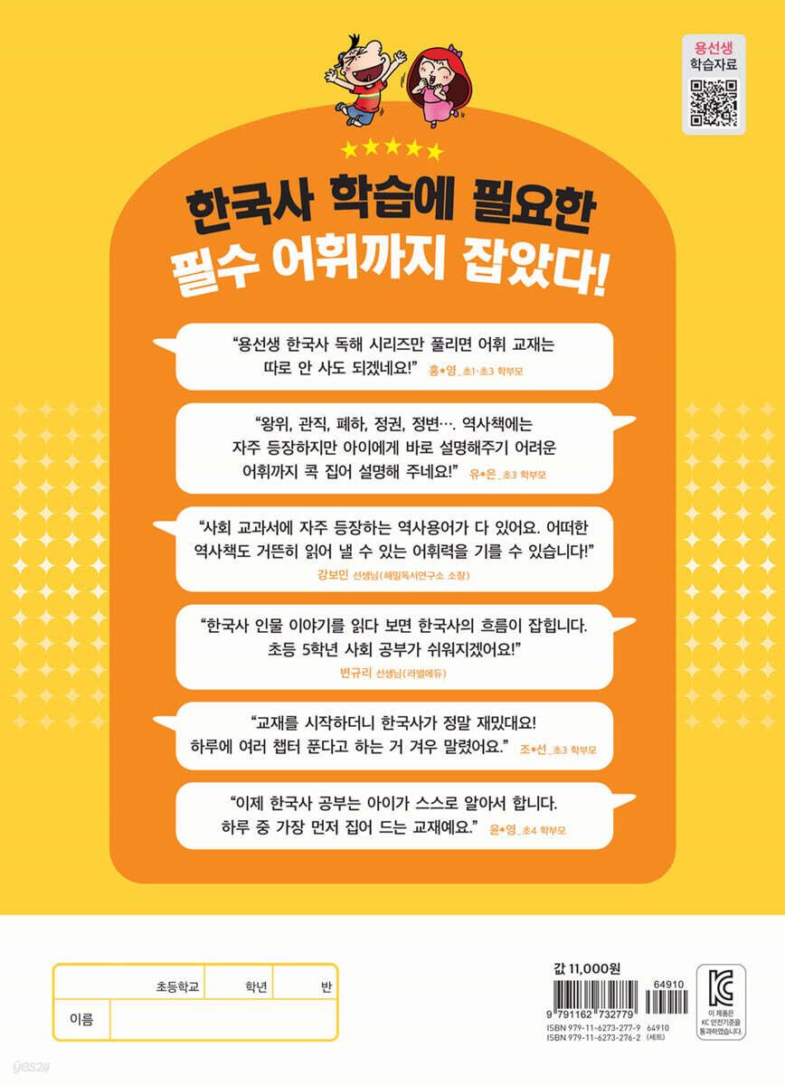 과연 비문학 장르의 글도 잘 이해할 수 있을까요? 독서를 잘하는 아이가 공부도 잘한다는 사실! 이제는 누구나 다 아는 사실이 되었습니다. 하지만 만화를 잘 읽는다고 해서, 혹은 창작 동화를 술술 읽는다고 해서 우리 아이 독해력이 좋다고 할 수 있을까요? 우선 독서를 하고 있으니 앞으로 성적은 잘 나오겠지 생각하면 오산입니다. 성적이 잘 나오게 하는 독서 방법은 따로 있습니다. 바로 비문학 독해 훈련에 달려 있는 것이지요. 비문학은 소설이나 시 등 문학과는 달리 다음 내용을 미리 짐작하기 어렵고, 일방적으로 쏟아내는 정보량이 많아 아이들이 쉽게 글에 흥미를 붙이기 어렵습니다. 대부분의 아이들은 지루해 하고 어렵게 느끼기 일쑤입니다. 그래서 많은 아이들이 교과서에서 비문학 장르의 글이 급격히 많아지는 초등학교 2~3학년 때부터 학습의 어려움을 호소합니다. 공부에 흥미를 느끼고 더 많은 것을 알아가야 할 시기에, 공부에 흥미를 잃고 포기하고 싶어집니다. 비문학의 장벽에 부딪히고 맙니다. 이러한 학부모와 어린이의 고민 해결을 위해 300만 독자가 선택한 초등 교육 전문 브랜드, 용선생이 나섰습니다. 그동안 『용선생의 시끌벅적 한국사』, 『용선생 교과서 한국사』, 『교양으로 읽는 용선생 세계사』 등을 출간하며 어린이 역사 교육에 힘써 온 사회평론 역사연구소에서 비문학 독해 훈련을 강화하며 한국사의 기초도 완성하는 『용선생 15분 한국사 독해』를 선보입니다. 『용선생 15분 한국사 독해(개정판)』에서는 어린이들의 학습 능력을 좌우하는 독해력과 어휘력을 키우는 동시에 한국사 관련 지식까지 자연스럽게 익힐 수 있는 교재입니다. ■ 교과서의 한국사 인물 총출동! 사회 교과서가 술술 읽힙니다! 『용선생 15분 한국사 독해(개정판)』에서는 우리 역사의 정치, 경제, 사회, 문화, 예술 등 다양한 분야에서 의미 있는 활동을 한 인물 120여 명의 이야기를 만날 수 있습니다. 초등 사회 교과서에 나오는 인물은 모두 담았고, 상대적으로 주목 받지 못했지만 생각해 보아야 할 옛 인물도 다뤘습니다. 앞으로 배울 초등 5학년 사회 교과서도 어렵지 않게 술술 읽어 나갈 수 있습니다. ■ 역사 인물의 이야기로 비문학 독해가 쉬워집니다! 용선생의 설명과 함께 옛 인물들의 생각과 대사를 읽다 보면 마치 그 시대 속으로 들어간 것 같이 생생하게 상황을 이해할 수 있습니다. 아이들은 역사 인물이 친근하고 때론 친구처럼 느껴져 한국사에 대한 흥미와 관심이 늘어납니다. 그만큼 비문학 독해가 낯설지 않고 재미있게 느껴져 비문학 독해 훈련을 재미있게 시작할 수 있습니다. ■ 역사 키워드는 기본! 어휘 학습 코너 신설! 『용선생 15분 한국사 독해(개정판)』에서는 각 회차마다 이야기 속에 알아두어야 할 역사 용어와 개념을 담았습니다. 시험에 잘 나오는 핵심 키워드에는 별표와 밑줄을 그어 아이들이 집중해 볼 수 있도록 했고, 지문을 다 읽은 후에는 다양한 유형의 문제를 풀며 핵심 키워드가 머릿속에 새겨질 수 있도록 구성했습니다. 개정판에서는 어휘 학습 코너를 신설했습니다. 핵심 키워드 외에도 역사 책에 자주 등장하는 용어 즉, 정변, 왕권, 강화, 사신, 천문 등 한자를 기반으로 한 어휘들까지도 그 뜻을 잘 이해할 수 있도록 다양한 유형의 문제를 출제하여 어휘를 제대로 익힐 수 있도록 했습니다. 인물 이야기를 음원으로도 들어 보세요! 『용선생 15분 한국사 독해』는 본문의 오디오 자료를 제공합니다. 문제를 풀기 전 혹은 문제를 다 푼 후 복습용으로도 자유롭게 활용하실 수 있습니다. 용선생의 친절한 설명은 물론 역사 인물의 생각과 대사를 전문 성우의 목소리로 더욱 실감 나게 들을 수 있습니다. |