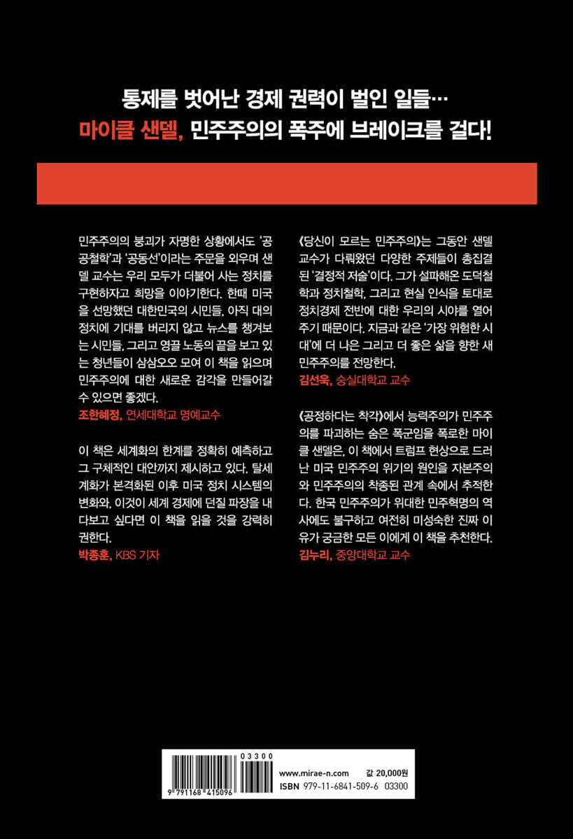 《공정하다는 착각》에서 능력주의가 민주주의를 파괴하는 숨은 폭군임을 폭로한 마이클 샌델은, 이 책에서 트럼프 현상으로 드러난 미국 민주주의 위기의 원인을 자본주의와 민주주의의 착종된 관계 속에서 추적한다. 한국 민주주의가 위대한 민주혁명의 역사에도 불구하고 여전히 미성숙한 진짜 이유가 궁금한 모든 이에게 이 책을 추천한다. - 김누리 (중앙대학교 교수)