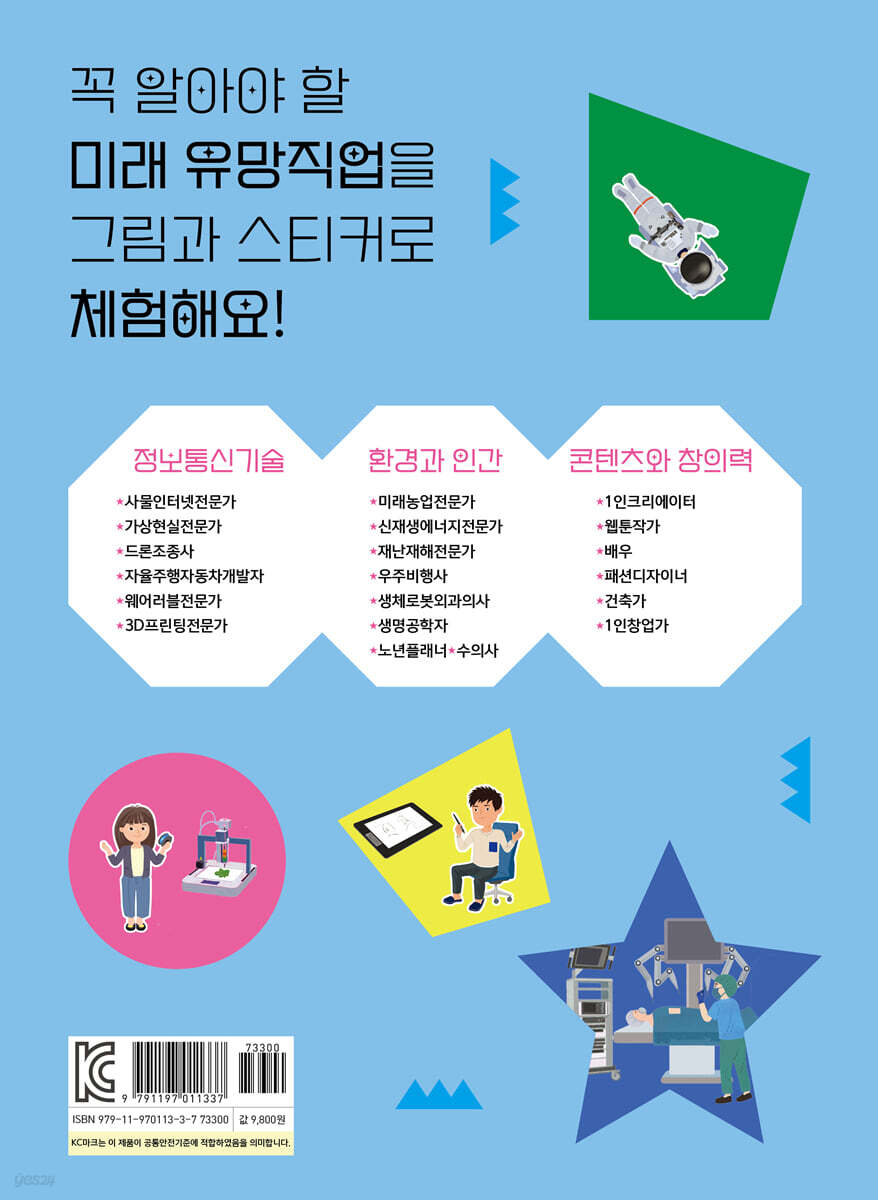 사물인터넷전문가 가상현실전문가 드론조종사 자율주행자동차개발자 웨어러블전문가 3D프린팅전문가 환경과 인간 미래농업전문가 신재생에너지전문가 재난재해전문가 우주비행사 생체로봇외과의사 생명공학자 노년플래너 수의사 콘텐츠와 창의력 1인크리에이터 웹툰작가 배우 패션디자이너 건축가 1인창업가 |