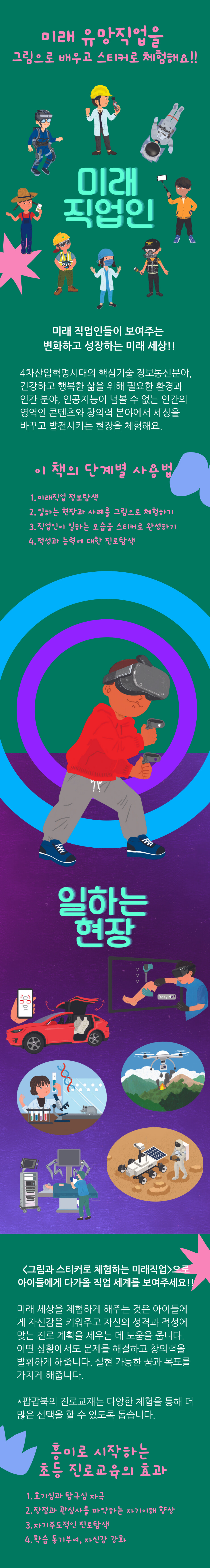 사회를 변화시키고 이끌어 가는 것이 무엇인지 아는 것입니다. 『그림과 스티커로 체험하는 미래직업』은 미래 세상의 중심 역할을 하는 직업인을 소개합니다. 특히 초등학생들에게 직업에 대한 흥미를 불러일으켜주기 위해 풍부한 현장 그림을 실었습니다. 거기에 더해 스티커놀이로 직업에 대한 관심을 한껏 높여줍니다. 다양한 체험은 창의력과 문제해결력을 길러주고 꿈과 목표를 현실적으로 실현 가능하게 만들어줍니다. 흥미에서 시작된 관심과 열정, 동기부여는 초등학생의 진로교육에서 가장 중요한 목표입니다. 실제 일하는 현장과 다양한 사례들을 보면서 직업인의 역할과 책임을 경험하는 것은 공감과 이해를 넘어 직업가치관을 형성하는 데 도움이 됩니다. 미래 세상을 배우고 체험함으로써 새로운 일과 직업에도 빠르게 적응할 수 있습니다. 인공지능이나 로봇이 가지지 못한 인간의 능력은 끊임없이 보고 배우며 함께함으로써 생겨납니다. 아이들이 공감과 소통에 뛰어난 창의적인 직업인으로 성장하는 데 이 책이 도움 되기를 바랍니다. |