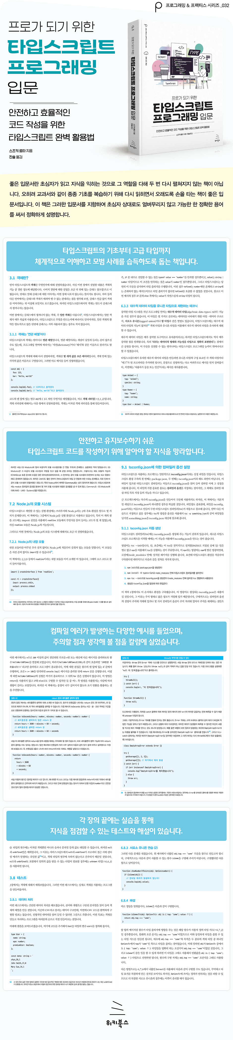 1.1 타입스크립트란? __1.1.1 자바스크립트에 대한 ‘정적 타이핑’ __1.1.2 뛰어난 표현력을 가진 타입 시스템 __1.1.3 정적 타이핑의 장점 (1) 타입 안전성 __1.1.4 정적 타이핑의 장점 (2) 문서화와 입력 자동 완성 __1.1.5 타입스크립트 연표 1.2 타입스크립트와 자바스크립트의 관계 __1.2.1 타입스크립트 컴파일러의 역할 (1) 타입 검사 __1.2.2 타입스크립트 컴파일러의 역할 (2) 트랜스파일 __1.2.3 타입스크립트와 ECMAScript의 관계 1.3 타입스크립트 개발 환경 __1.3.1 Node.js 설치 __1.3.2 에디터 준비 __1.3.3 디렉터리 생성 및 타입스크립트 설치 __1.3.4 tsconfig.json 준비 __1.3.5 첫 타입스크립트 프로그램 02장: 기본 문법 / 기본 타입 2.1 문, 그리고 식 __2.1.1 문, 식의 기본 __2.1.2 문과 식은 ‘결과’의 유무로 구별한다 __2.1.3 표현문 2.2 변수의 선언과 사용 __2.2.1 변수 선언 구문 __2.2.2 식별자 __2.2.3 변수에 타입 표기하기 __2.2.4 let 변수 선언과 변수 재할당 2.3 원시 타입 __2.3.1 원시 값이란 무엇인가 __2.3.2 타입스크립트에서의 숫자 타입의 특징 __2.3.3 숫자 리터럴 __2.3.4 임의 정밀도 정수(BigInt) __2.3.5 문자열 타입과 3종류의 문자열 리터럴 __2.3.6 문자열 안의 이스케이프 시퀀스 __2.3.7 불리언 값과 불리언 리터럴 __2.3.8 null과 undefined __2.3.9 원시 값 변환 (1) 암묵적 변환 __2.3.10 원시 값 변환 (2) 명시적 변환 2.4 연산자 __2.4.1 산술 연산자 (1) 이항 연산자 __2.4.2 산술 연산자 (2) 단항 연산자 __2.4.3 + 연산자로 문자열 결합하기 __2.4.4 비교 연산자와 등가 연산자 __2.4.5 논리 연산자 (1) 불리언 연산 __2.4.6 논리 연산자 (2) 일반형과 단락 평가 __2.4.7 조건 연산자 __2.4.8 대입 연산자 __2.4.9 그 밖의 연산자 2.5 기본적인 제어 구문 __2.5.1 조건 분기 (1) if 문의 기본 __2.5.2 블록 __2.5.3 조건 분기 (2) else 사용 __2.5.4 switch 문 __2.5.5 while 문 루프 __2.5.6 for 문 루프 2.6 테스트 __2.6.1 FizzBuzz __2.6.2 해설 03장: 객체의 기본과 객체의 타입 3.1 객체란? __3.1.1 객체는 ‘연관 배열’이다 __3.1.2 객체 리터럴 (1) 기본 구문 __3.1.3 객체 리터럴 (2) 프로퍼티명 지정 방법 __3.1.4 프로퍼티 접근 : 값 취득과 대입 __3.1.5 객체 리터럴 (3) 전개 구문 __3.1.6 객체는 어떤 경우에 ‘같은’가 3.2 객체의 타입 __3.2.1 객체 타입 사용법 __3.2.2 객체 타입의 타입 검사와 안전성 __3.2.3 type 문으로 타입에 별명 붙이기 __3.2.4 interface 선언으로 객체 타입 선언하기 __3.2.5 임의 프로퍼티명을 허용하는 타입(인덱스 시그니처) __3.2.6 선택적 프로퍼티 선언 __3.2.7 읽기 전용 프로퍼티 선언 __3.2.8 typeof 키워드로 변숫값 얻기 3.3 서브타입 관계 __3.3.1 서브타입이란? __3.3.2 프로퍼티의 포함 관계에 의한 서브타입 관계 성립 __3.3.3 초과 프로퍼티에 대한 타입 에러 3.4 타입 인수를 가지는 타입 __3.4.1 타입 인수를 가지는 타입 선언하기 __3.4.2 타입 인수를 가진 타입 사용하기 __3.4.3 서브타입 관계에 따른 타입 인수의 제약 __3.4.4 선택적 타입 인수 3.5 배열 __3.5.1 배열 리터럴로 배열 만들기 __3.5.2 배열 요소에 접근하기 __3.5.3 배열 타입 기법 __3.5.4 readonly 배열 타입 __3.5.5 배열의 기능 사용하기 __3.5.6 for-of 문 루프 __3.5.7 튜플 타입 3.6 분해 할당 __3.6.1 객체의 분해 할당 (1) 기본 패턴 __3.6.2 객체의 분해 할당 (2) 중첩 구조 분해 __3.6.3 배열의 분해 할당 __3.6.4 분해 할당의 기본값 __3.6.5 rest 패턴으로 객체의 나머지 얻기 3.7 그 밖의 내장 객체 __3.7.1 Date 객체 __3.7.2 정규 표현 객체 (1) 정규 표현의 기본 __3.7.3 정규 표현 객체 (2) 정규 표현을 사용하는 방법 __3.7.4 Map 객체·Set 객체 __3.7.5 원시 값인데 프로퍼티가 있다? 3.8 테스트 __3.8.1 데이터 처리 __3.8.2 해설 __3.8.3 다른 해답 04장: 타입스크립트의 함수 4.1 함수를 만드는 법 __4.1.1 함수 선언으로 함수 만들기 __4.1.2 반환값이 없는 함수 만들기 __4.1.3 함수 표현식으로 함수 만들기 __4.1.4 화살표 함수 표현식으로 함수 만들기 __4.1.5 화살표 함수 표현식의 생략형 __4.1.6 메서드 기법으로 함수 만들기 __4.1.7 가변 인수 선언 __4.1.8 함수를 호출할 때의 전개 구문 __4.1.9 선택적 인수 선언 __4.1.10 콜백 함수 사용해 보기 4.2 함수의 타입 __4.2.1 함수 타입 표기법 __4.2.2 반환값의 타입 표기는 생략할 수 있다 __4.2.3 반환값의 타입 표기는 생략해야 하는가 __4.2.4 인수의 타입 표기를 생략할 수 있는 경우 __4.2.5 호출 시그니처를 이용한 함수 타입 표현 4.3 함수 타입의 서브타입 관계 __4.3.1 반환값 타입에 따른 서브타입 관계 __4.3.2 인수 타입에 따른 서브타입 관계 __4.3.3 인수의 수에 따른 서브타입 관계 4.4 제네릭 __4.4.1 함수의 타입 인수란 __4.4.2 함수의 타입 인수를 선언하는 방법 __4.4.3 함수의 타입 인수는 생략할 수 있다 __4.4.4 타입 인수를 지닌 함수 타입 4.5 변수 스코프와 함수 __4.5.1 변수의 스코프란 __4.5.2 블록 스코프와 함수 스코프 4.6 테스트 __4.6.1 간단한 함수 만들어보기 __4.6.2 해설 __4.6.3 콜백 함수 연습 4.6.4 해설 05장: 타입스크립트의 클래스 5.1 클래스의 선언과 사용 __5.1.1 클래스 선언과 new 구문 __5.1.2 프로퍼티 선언 __5.1.3 메서드 선언 __5.1.4 생성자 __5.1.5 정적 프로퍼티·정적 메서드 __5.1.6 세 종류의 접근 제한자 __5.1.7 생성자 인수에서의 프로퍼티 선언 __5.1.8 클래스 표현식으로 클래스 만들기 __5.1.9 또 하나의 비