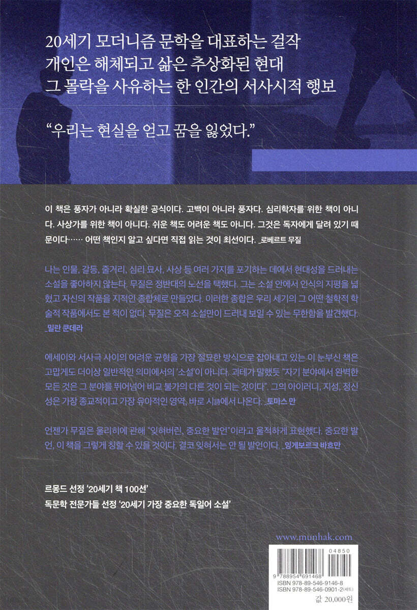 나는 인물, 갈등, 줄거리, 심리 묘사, 사상 등 여러 가지를 포기하는 데에서 현대성을 드러내는 소설을 좋아하지 않는다. 무질은 정반대의 노선을 택했다. 그는 소설 안에서 인식의 지평을 넓혔고 자신의 작품을 지적인 종합체로 만들었다. 이러한 종합은 우리 세기의 그 어떤 철학적 학술적 작품에서도 본 적이 없다. 무질은 오직 소설만이 드러내 보일 수 있는 무한함을 발견했다. - 밀란 쿤데라 (소설가)