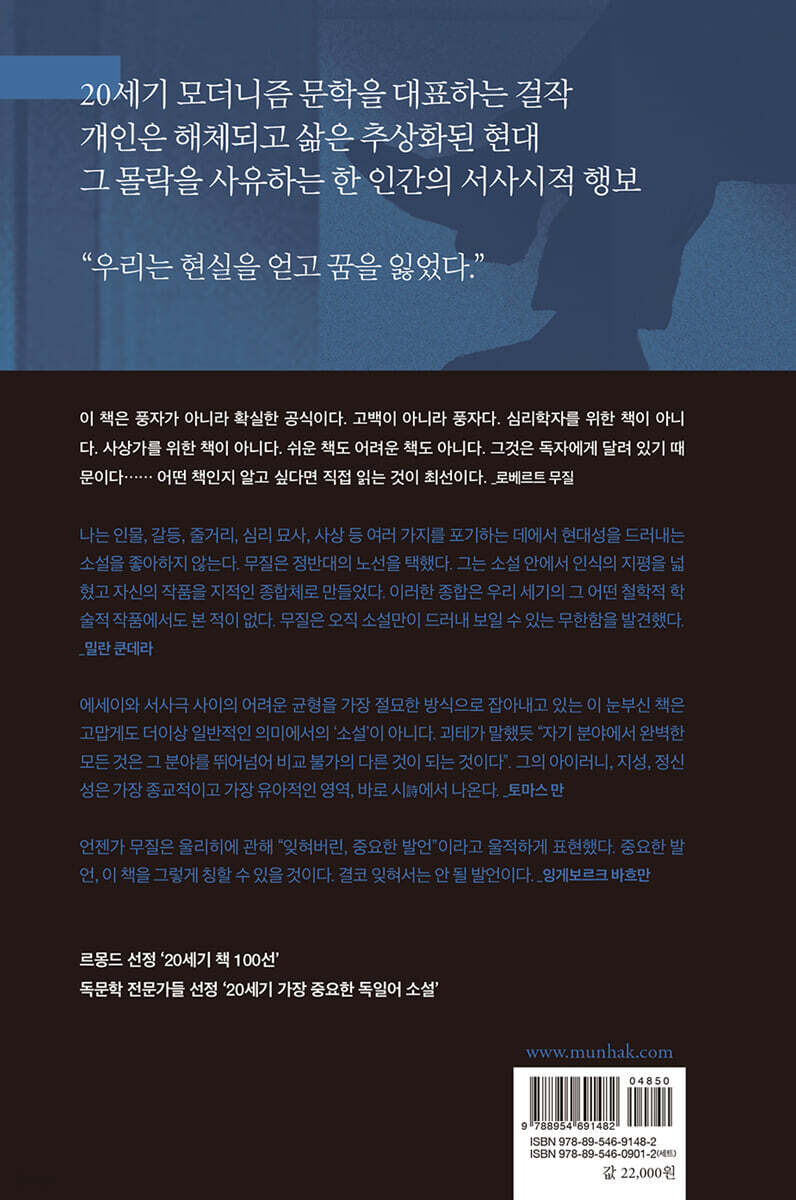 나는 인물, 갈등, 줄거리, 심리 묘사, 사상 등 여러 가지를 포기하는 데에서 현대성을 드러내는 소설을 좋아하지 않는다. 무질은 정반대의 노선을 택했다. 그는 소설 안에서 인식의 지평을 넓혔고 자신의 작품을 지적인 종합체로 만들었다. 이러한 종합은 우리 세기의 그 어떤 철학적 학술적 작품에서도 본 적이 없다. 무질은 오직 소설만이 드러내 보일 수 있는 무한함을 발견했다. - 밀란 쿤데라 (소설가)