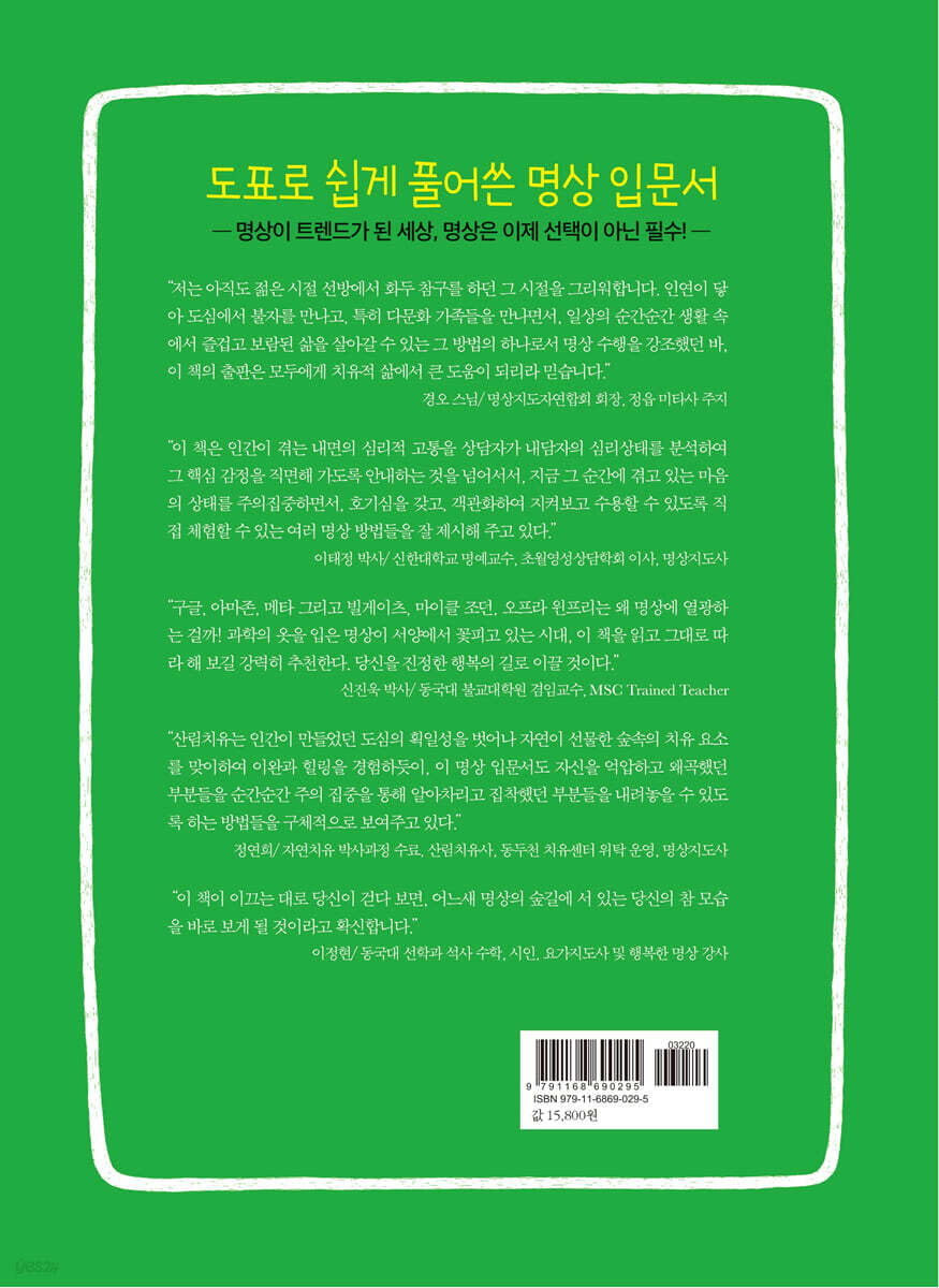 “이 책이 이끄는 대로 당신이 걷다 보면, 어느새 명상의 숲길에 서 있는 당신의 참 모습을 바로 보게 될 것이라고 확신합니다.” - 이정현 (동국대 선학과 석사 수학, 시인, 요가지도사 및 행복한 명상 강사)