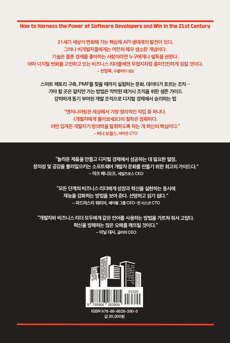 프롤로그 | 시작은 광고판이었다 1부 왜 그 어느 때보다 지금 개발자가 중요한가 1장 만들거나 혹은 죽거나 2장 새로운 소프트웨어 공급망 2부 개발자를 이해하고 동기부여 하기 3장 제 이름은 제프고 개발자예요 4장 코드는 창의적이다 5장 실험은 혁신의 전제조건 6장 코드 몽키가 되고 싶은 개발자는 없다 3부 개발자를 성공으로 이끄는 법 7장 열린 학습 환경 만들기 8장 소규모팀과 단일 스레드 리더 9장 우리는 고객 편이에요 10장 쉽게 이해하는 애자일 11장 인프라 구조에 투자하라 에필로그 | 소프트웨어 개발자와 함께하는 길 감사의 말 |