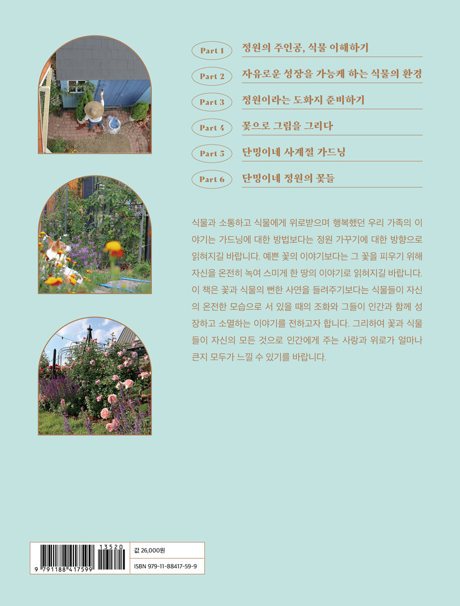사계절 꽃피우는 부부의 시크릿 가든 이야기 식물과 소통하고 식물에게 위로받으며 행복했던 부부의 이야기가 가드닝 안내서로 독자들을 찾아간다. 자연을 좀 더 가까이 두고자 하는 사람들의 열망이 베란다 가드닝, 정원 가드닝, 플랜테리어, 식물테라피 등 다양한 이름으로 불리며 인간의 일상 속으로 스며들고 있는 요즈음, 『단밍이네 어린 정원』은 꽃과 식물들로부터 치유받는 아주 구체적인 방법을 안내한다. 단밍이네 정원에서는 많은 다양한 꽃들을 만날 수 있다. 이른 봄 비올라들의 해를 따라 움직이는 병정놀이는 귀엽게 흐드러지고 수선화의 청초함이 곳곳에서 피어오르며 겨우내 땅속에서 인내한 튤립의 굳건함은 놀랍기만 하다. 휘어지는 페튜니아의 풍성함은 아직 채워지지 않은 정원의 빈자리를 덮고 포기번식이 놀라운 마가렛은 생명의 신비를 느끼게 한다. 노지의 한기를 이겨낸 겨울 파종이들이 보이지 않는 뿌리의 힘으로 봄 땅을 딛고 오르며, 지면을 덮어 푸른 바다를 이루는 네모필라는 잎 하나하나의 빛깔이 곱고 고와 한복의 여리한 옷깃처럼 수줍기 그지없다. 세상의 꽃들은 각기 다른 모양과 빛깔과 크기를 가지고 있다. 더불어 생육에 알맞은 온도와 개화 시기와 지속 기간을 지니고 있다. 정원사는 이러한 꽃의 특징을 잘 이해해야 한다. 자신이 추구하는 정원의 모습을 디자인하고 주를 이루는 색과 톤을 결정하고 개화시기에 따라 꽃들을 분류하며 그 모든 일련의 과정을 머릿속에 그려야 한다. 기실 꽃을 키운다는 것은 오랜 준비와 과정이 필요한 일, 『단밍이네 어린 정원』은 모든 이의 정원에서 살뜰하게 정원 일을 일러주는 옆집 부부의 조언 같은 책이다. 이 책과 함께라면 누구라도 자신의 정원을 가꾸는 일, 꿈꾸는 일에 선뜻 발을 디딜 수 있을 것이다. |