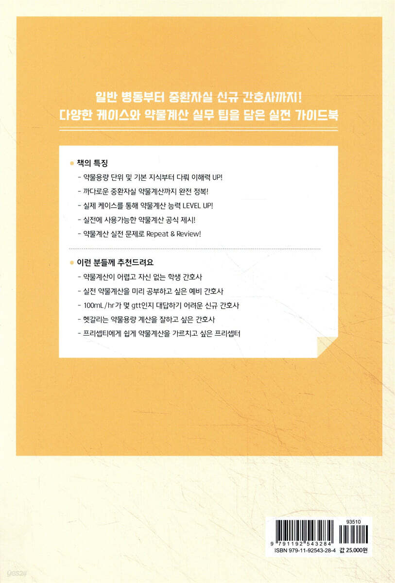 다양한 케이스와 약물계산 실무 팁을 담은 실전 가이드북 - 약물용량 단위 및 기본 지식부터 다뤄 이해력 UP! - 까다로운 중환자실 약물계산까지 완전 정복! - 실제 케이스를 통해 약물계산 능력 LEVEL UP! - 실전에 사용가능한 약물계산 공식 제시! - 약물계산 실전 문제로 Repeat & Review! 이런 상황일 때 추천합니다. · 응급실에 발령 받은 신규 간호사 · 입사를 앞두고 응급상황이 두려운 신규 간호사 · 모든 과 환자를 간호하기 부담스러운 신규 간호사 · 응급상황에서 우선순위 정하는 것이 어려운 저년차 간호사 · 좀 더 깊이 있는 공부를 하고 싶은 2~3년차 간호사 · 응급실에서 프리셉터를 앞두고 있는 간호사 |