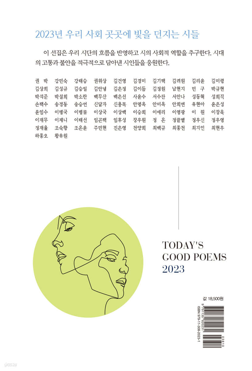 2022년에 발간된 문예지에 발표된 작품들 가운데서 72편을 선정해 수록한다. 코로나19, 자본주의, 도시, 기후 변화, 노동, 전쟁, 가족, 가난, 민족, 시 쓰기 등의 제재가 주목된다. 시인들이 오늘의 사회 상황을 깊게 반영한 것으로 보인다. 이 선집은 예년과 마찬가지로 좋은 작품을 수록하려고 노력했다. 그렇지만 워낙 많은 시인이 시단에서 활동하고 있기에 한계가 분명하다. 시인들의 혜량을 구한다. 이 선집은 작품의 우열을 가리기보다는 오늘의 시단 상황을 살펴보는 데 의의를 두고 있다. 성격이 뚜렷한 선집들이 많이 간행되기를 기대한다. 선집의 엮은이들은 책임감을 갖는다는 차원에서 작품마다 해설을 달았다. 필자의 표기는 다음과 같다. 김지윤=a, 맹문재=b, 오연경=c 2019년 12월에 발생해 전 세계가 고통을 겪고 있는 코로나19, 자본주의 체제로 인해 심화하는 인간 소외와 불평등, 지구 온난화와 기후 변화로 겪어야 하는 재난들, 러시아의 우크라이나 침략에서 보듯이 잔인한 전쟁들, 159명의 젊은이가 압사당한 이태원 참사, 일본은 사과하지 않는데 우리의 재원으로 일제 강제 징용 피해자들에게 배상하려는 반역사적인 정부, 서민들을 힘들게 하는 높은 물가와 대출이자, 친일문인을 기리는 문학상……. 이 험난한 세상에서 좋은 시를 쓰기 위해 분투하는 시인들. 기꺼이 응원한다. |