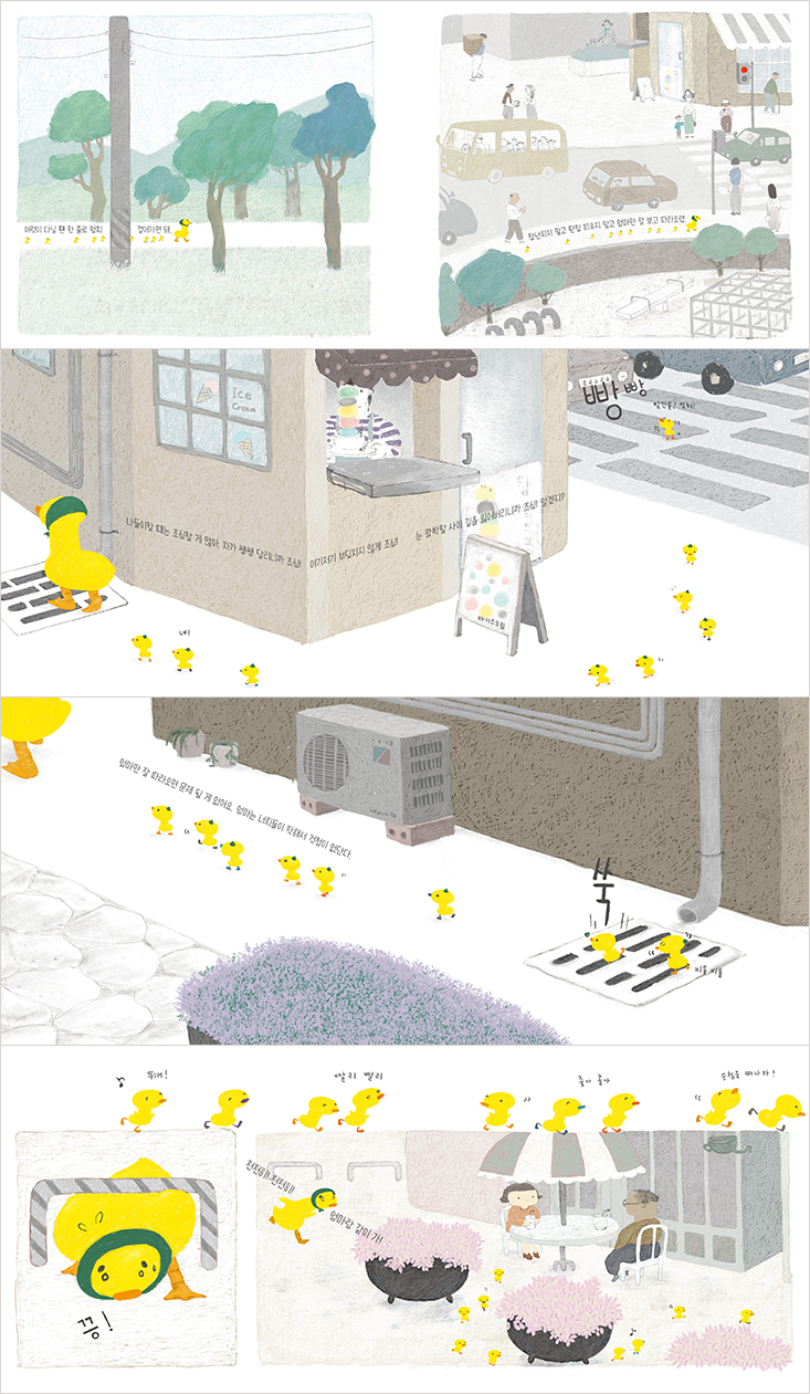 엄마 오리 말을 잘 듣는데 왜 아기 오리들에게 문제가 생길까요? 양육자가 아이를 데리고 나들이하는 상황을 떠올려 볼까요? 먼저 아이의 옷과 간식을 챙기고, 길을 검색하고, 아이가 겪을 만한 위험 요소를 미리 상상하고 대처하려고 최대한 노력할 거예요. 그래도 불안하다면? 걱정을 한 보따리 어깨에 짊어지고 집을 나설 거예요. 이러한 양육자의 불안한 마음을 표현한 엄마 오리는 애정 어린 잔소리를 주저리주저리, 멈추지 않지요. 그럼 아이 입장에서는? 새로운 곳을 가는 설렘과 기대감에 부풀어서 재미난 일들을 상상하는데 엄마는 위험하고 조심한 것들을 알려 주느라 다른 생각을 할 여유조차 없다면 어떨까요? 아이는 나들이하는 기분이 금방 시들어 버리고, 지루해할 거예요. 『엄마 오리 아기 오리』는 이처럼 육아 일상에서 겪는 진솔한 에피소드를 유머러스한 이야기로 풀어낸 작품입니다. 나들이 가는 길에 양육자와 아이의 다른 생각을 대비하여 보여 주면서 누구나 쉽게 공감할 수 있는 이야기를 선보입니다. 엄마 오리의 올바른 말은 줄줄이 이어지는데, 이상하게도 엄마 오리의 잔소리를 들을수록 아기 오리들은 위험에 빠지는 아이러니한 상황이 펼쳐집니다. 신호등 신호를 지키고, 차 조심을 하고, 서로 배려하라는 엄마 오리의 말은 맞는 말인데, 엄마 오리의 뜻대로 일이 풀리지 않아요. 과연 오리 가족은 첫 나들이를 잘 다녀올 수 있을까요? 엉망진창 나들이 vs 상상 만발 모험 엄마와 아이를 모두 응원하는 그림책 엄마 오리는 아기 오리들을 길에서 잠시 잃어버렸다가 찾은 뒤 홧김에 제안을 합니다. 오늘 나들이는 망쳤고 집으로 돌아가자고 하면서 말해요. “이번엔 너희들이 먼저 가. 엄마가 뒤따라갈 거야.” 집으로 가는 길은 아기 오리들이 앞장서고 엄마 오리가 쫓아가는 형국이지요. 이제 아기 오리들은 스스로 길을 선택하고 이끌 수 있는 권리가 주어진 거예요. 아기 오리들은 높고 좁다란 담벼락 위를 용감하게 뛰어가고, 철망으로 된 울타리를 재빨리 탈출하고, 웅덩이를 수영장 삼아 즐겁게 놀아요. 엄마 오리 눈에는 온통 위험하고 더러운 것투성이지만 아기 오리 눈에는 모든 것이 궁금하고 신나는 놀이터가 되지요. 아기 오리들은 집이 아니라 멋진 성으로 달려가는 용감한 오리를 상상하고 있으니까요. 이순옥 작가는 엄마 오리와 아기 오리의 역할 바꾸기에 맞춰 후반부 장면 연출에 공을 들였어요. 전반부를 잔잔한 분위기의 펼침면으로 구성했다면, 엄마 오리가 아기 오리를 헐레벌떡 쫓아가는 후반부는 만화 컷을 다양하게 활용해서 짜임새 있게 이야기를 펼쳐 보입니다. 얼핏 육아에 서툰 엄마 오리의 힘겨운 나들이처럼 보이지만 기운이 생생하고 싱그러운 아기 오리들을 보고 있자면 더할 나위 없이 즐거운 모험이에요. 작가는 엄마와 아기에게 동등하게 사랑스러운 시선을 보내며 이야기를 완성해 냅니다. 엄마 오리의 걱정거리는 사라져 버려요. 씩씩하게 앞으로 나아가는 아기 오리들의 유쾌한 상상 덕분이지요. |