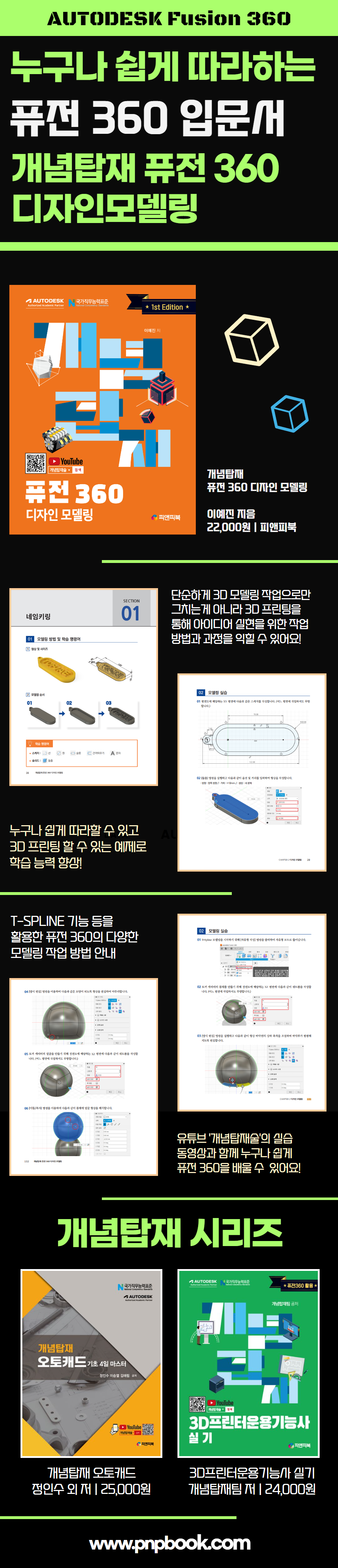 SECTION 1 Fusion 360의 소개 10 01 Fusion 360 소개 10 02 Fusion 360의 익스텐션 11 SECTION 2 Fusion 360의 인터페이스 12 01 Fusion 360의 인터페이스 12 02 Fusion 360의 작업 공간 13 SECTION 3 Fusion 360의 화면 제어 14 01 마우스 + 키보드 14 02 뷰 큐브(View Cube) 15 SECTION 4 Fusion 360의 옵션 16 01 일반 17 02 일반 - 디자인 19 03 기본 단위 - 디자인 21 SECTION 5 디자인 열기 및 업로드 22 01 프로젝트에서 기존 디자인 열기 22 02 내 컴퓨터에서 디자인 열기 23 03 디자인 업로드하기 24 SECTION 6 새 디자인 작성 및 저장 26 01 새 디자인 작성하기 26 02 새 디자인 저장하기 27 03 기존 디자인을 새 디자인으로 저장하기27 SECTION 7 디자인 내보내기 29 01 디자인 내보내기 29 02 STL, OBJ, SMF 파일 내보내기 30 SECTION 8 STL 파일 편집하기 32 CHAPTER. 02 디자인 모델링 36 SECTION 1 네임키링 38 SECTION 2 파티션 걸이 43 SECTION 3 휴대폰 거치대 47 SECTION 4 쇼핑백 손잡이 52 SECTION 5 칫솔꽂이 58 SECTION 6 도장 61 SECTION 7 미니 화분 66 SECTION 8 팬 74 SECTION 9 머그컵 80 SECTION 10 종이컵 홀더 88 SECTION 11 봉투 클립 94 SECTION 12 사무용 집게 102 SECTION 13 물병 107 SECTION 14 디저트 스푼 118 SECTION 15 디저트 포크 124 SECTION 16 토끼 캐릭터 130 SECTION 17 의자 139 |