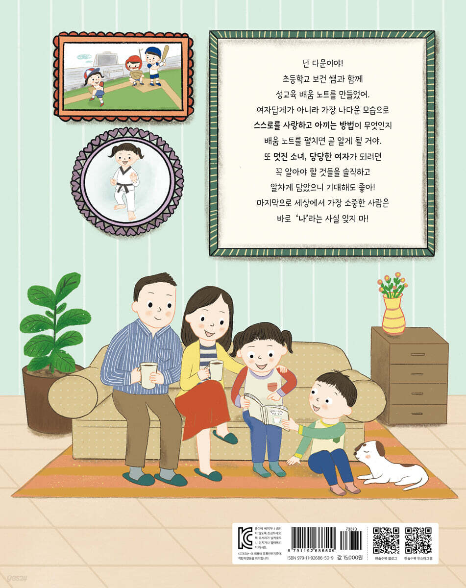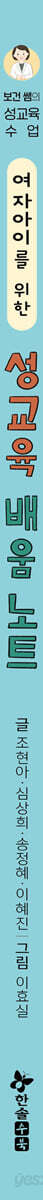 07 엄마+아빠+♥=나 08 내 첫 집은 엄마 배 속 10 아동에서 청소년으로 성장 중 12 비밀에 싸인 생식기 14 여자가 되어 가는 사춘기의 몸 16 특별하고 자연스러운 경험, 월경 18 이랬다저랬다 사춘기 때 마음 2교시 모두 소중해! 21 있는 그대로의 내 모습이 소중해 22 내 몸을 건강하게 23 내 몸을 깨끗하게 24 내 몸과 마음의 주인은 나 26 여자답게 말고 나답게 28 소중한 친구를 위해서 30 슬기로운 연애 생활 3교시 가족 또한 소중해! 33 가족이란? 34 달라도 모두 소중한 가족 36 엄마는 슈퍼우먼이 아니야! 38 가족이라도 성 예절이 필요해 4교시 성폭력을 조심해! 41 몸과 마음에 상처를 주는 성폭력 42 다양한 형태의 성폭력 44 성폭력 올바르게 대처하기 |