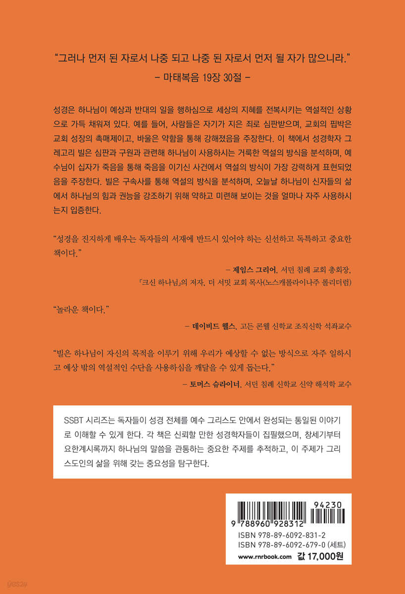 “그레고리 빌은 우리 시대의 상당히 통찰력 있고 매력적인 신약 학자다. 그는 역사적 맥락에서 본문을 해석할 뿐 아니라, 특정 구절과 단락이 성경 전체의 거대한 이야기 흐름에 얼마나 정교하게 들어맞는지도 설명한다. 가독성이 높은 이 책에서 빌은 하나님이 자신의 목적을 이루기 위해 우리가 예상할 수 없는 방식으로 자주 일하고 예상 밖의 역설적인 수단을 사용하심을 깨달을 수 있게 돕는다. 우리는 빌의 연구를 통해 하나님이 자신의 목적과 뜻을 주권적으로 이루고 계심과 우리 삶을 하나님께 기꺼이 맡길 수 있음을 알게 된다.” - 토머스 슈라이너 (서던 침례 신학교 신약 해석학 교수)